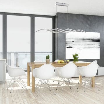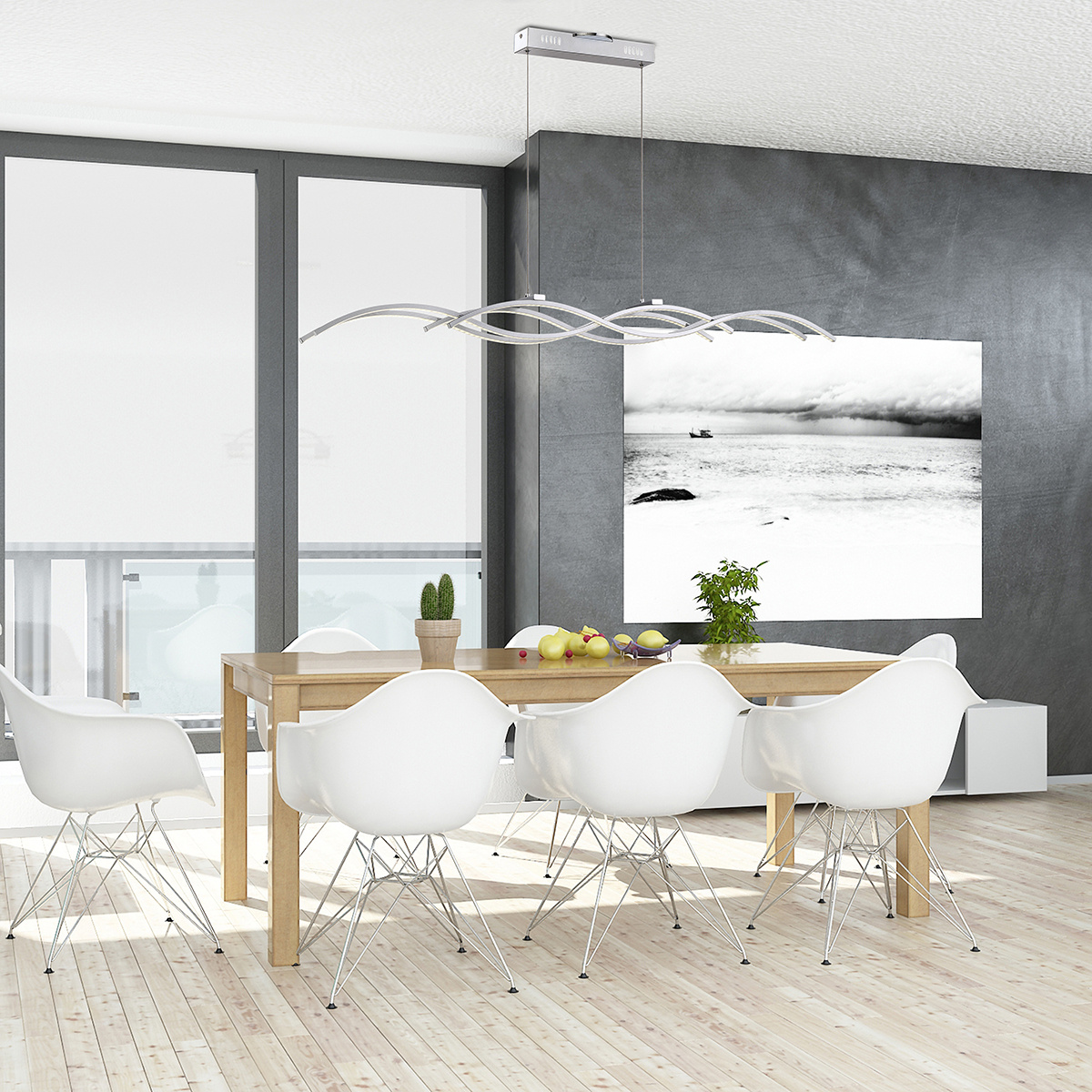 This ultra modern pendant features four slinky aluminum waves of integrated LED. The slender bands add a delicate elegance emulating the motion of the ocean.