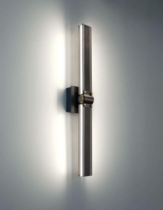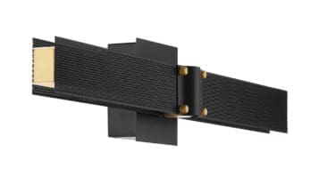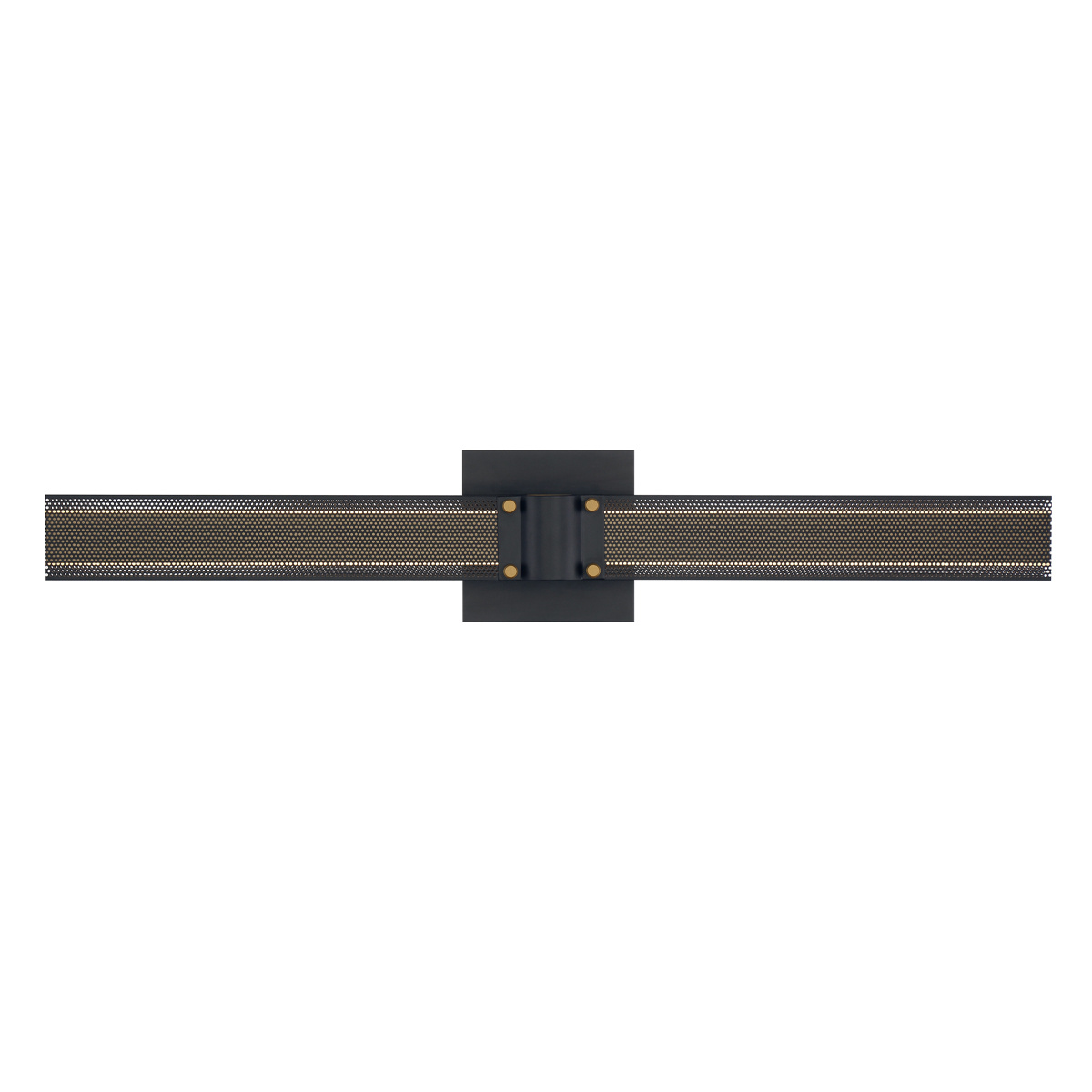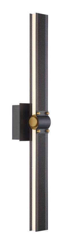 LED bands of integrated light beam through intricate filigreed metalwork that acts as a unique way to diffuse light. An inviting warmth radiates from this collection, highlighting matte black, rich brass, and decorative gold rivets with a dark perforated lens. This extensive family offers circular chandeliers, rectangular chandeliers and linear pendants, as well as a wall sconce that can be horizontal or vertical for endless applications.