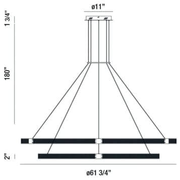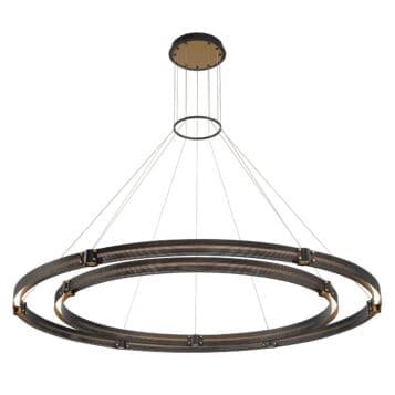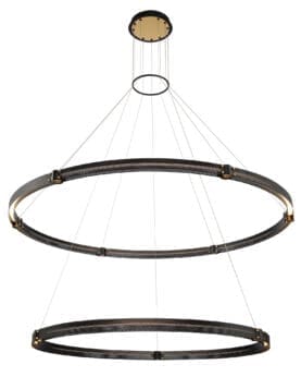 LED bands of integrated light beam through intricate filigreed metalwork that acts as a unique way to diffuse light. An inviting warmth radiates from this collection, highlighting matte black, rich brass, and decorative gold rivets with a dark perforated lens. This extensive family offers circular chandeliers, rectangular chandeliers and linear pendants, as well as a wall sconce that can be horizontal or vertical for endless applications.