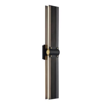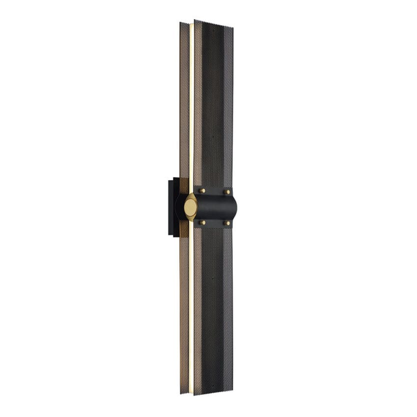 LED bands of integrated light beam through intricate filigreed metalwork that acts as a unique way to diffuse light. An inviting warmth radiates from this collection, highlighting matte black, rich brass, and decorative gold rivets with a dark perforated lens. This extensive family offers circular chandeliers, rectangular chandeliers and linear pendants, as well as a wall sconce that can be horizontal or vertical for endless applications.