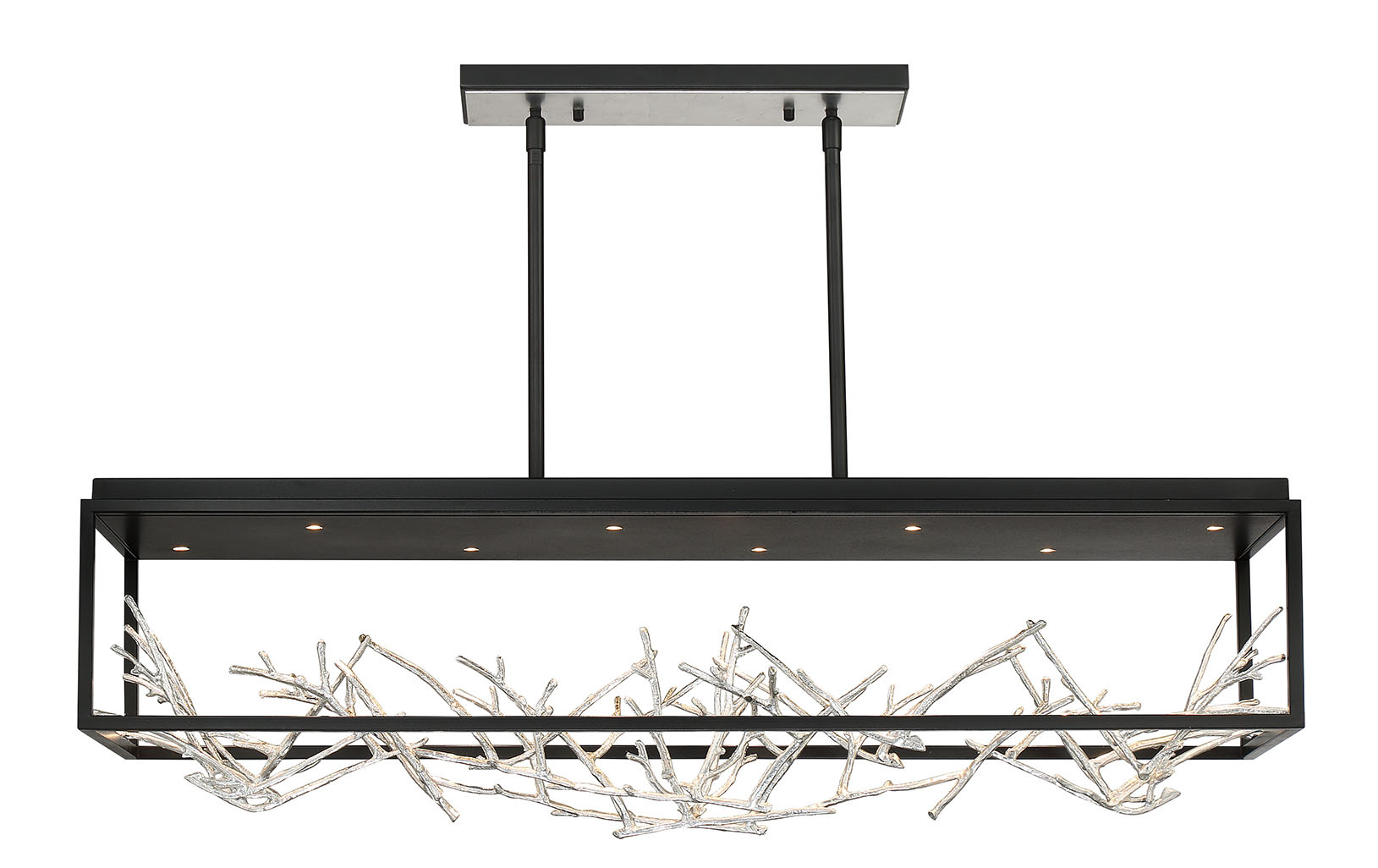 Free-flowing, gilded branches of gold and silver float elegantly within a stylish open cage constructed of cast brass and finished for the rigors of outdoor environments. The thin twigs are handcrafted with metal foil and accentuated by pinhole recessed LED lighting to add a luxurious glow to this nature-inspired collection.