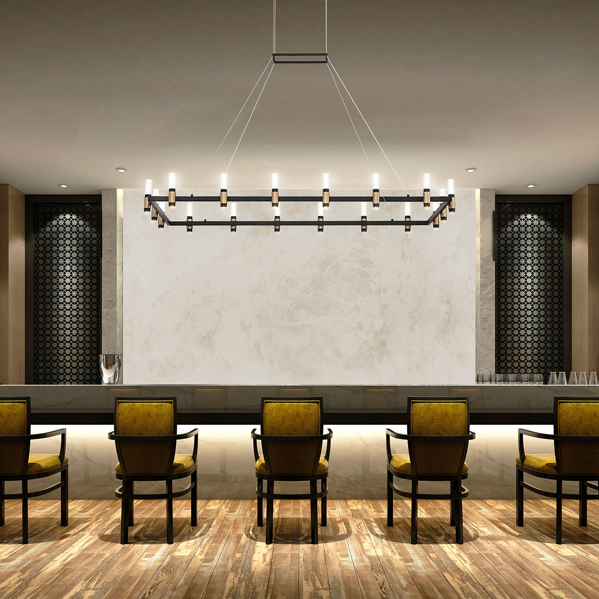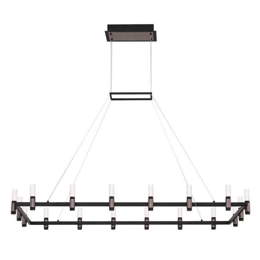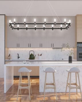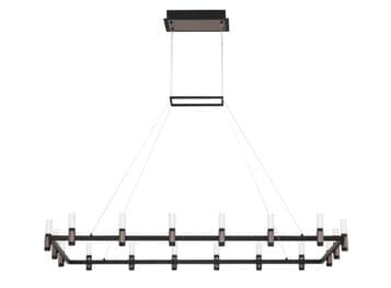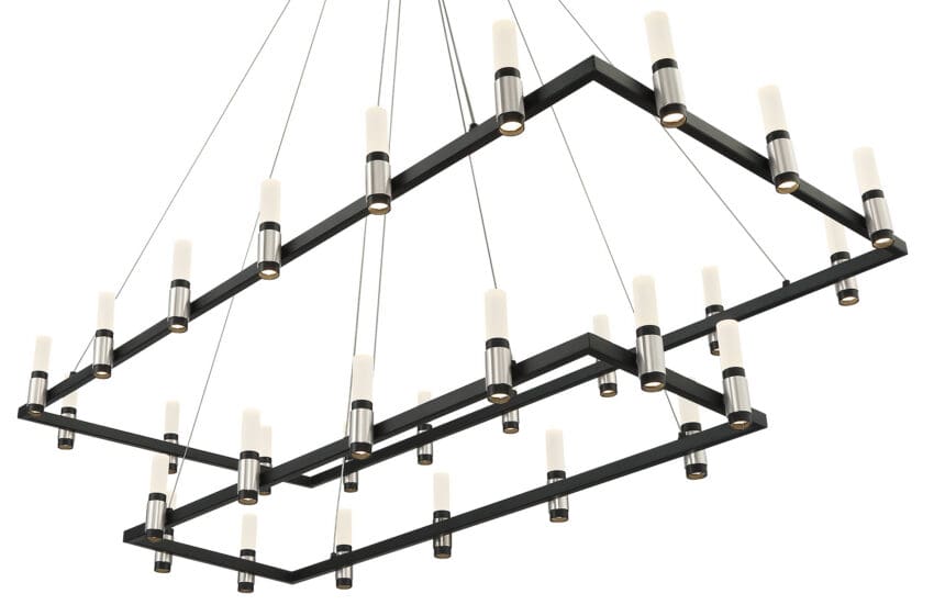 A soft industrial design features LED lights that are nestled within black candleholders accented with satin nickel. The cooler tones of this collection fit perfectly with the cool raw and unfinished décor style that’s inspiring a new wave of trends. Options include 1- or 3-tiers for grand spaces.