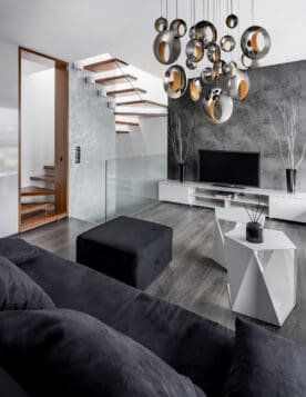 Hollowed orbs of blackened chrome LED are reminiscent of molten lava. Each hollowed orb is highlighted with a golden interior. A weightless design, buoyantly floating, add an effervescent character to your décor.