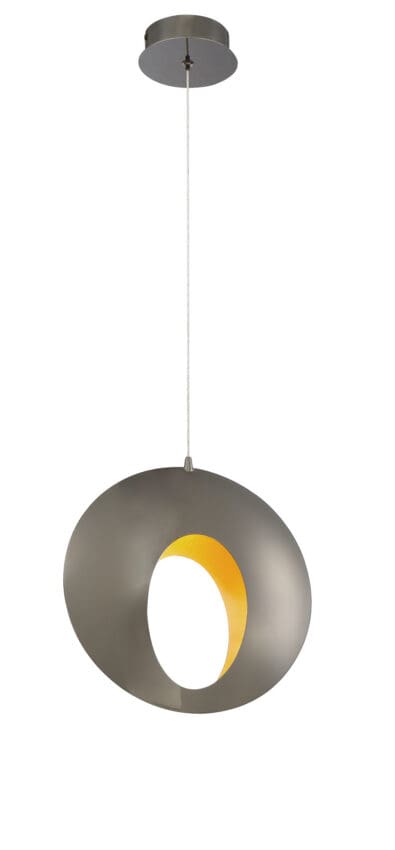 Hollowed orbs of blackened chrome LED are reminiscent of molten lava. Each hollowed orb is highlighted with a golden interior. A weightless design, buoyantly floating, add an effervescent character to your décor.