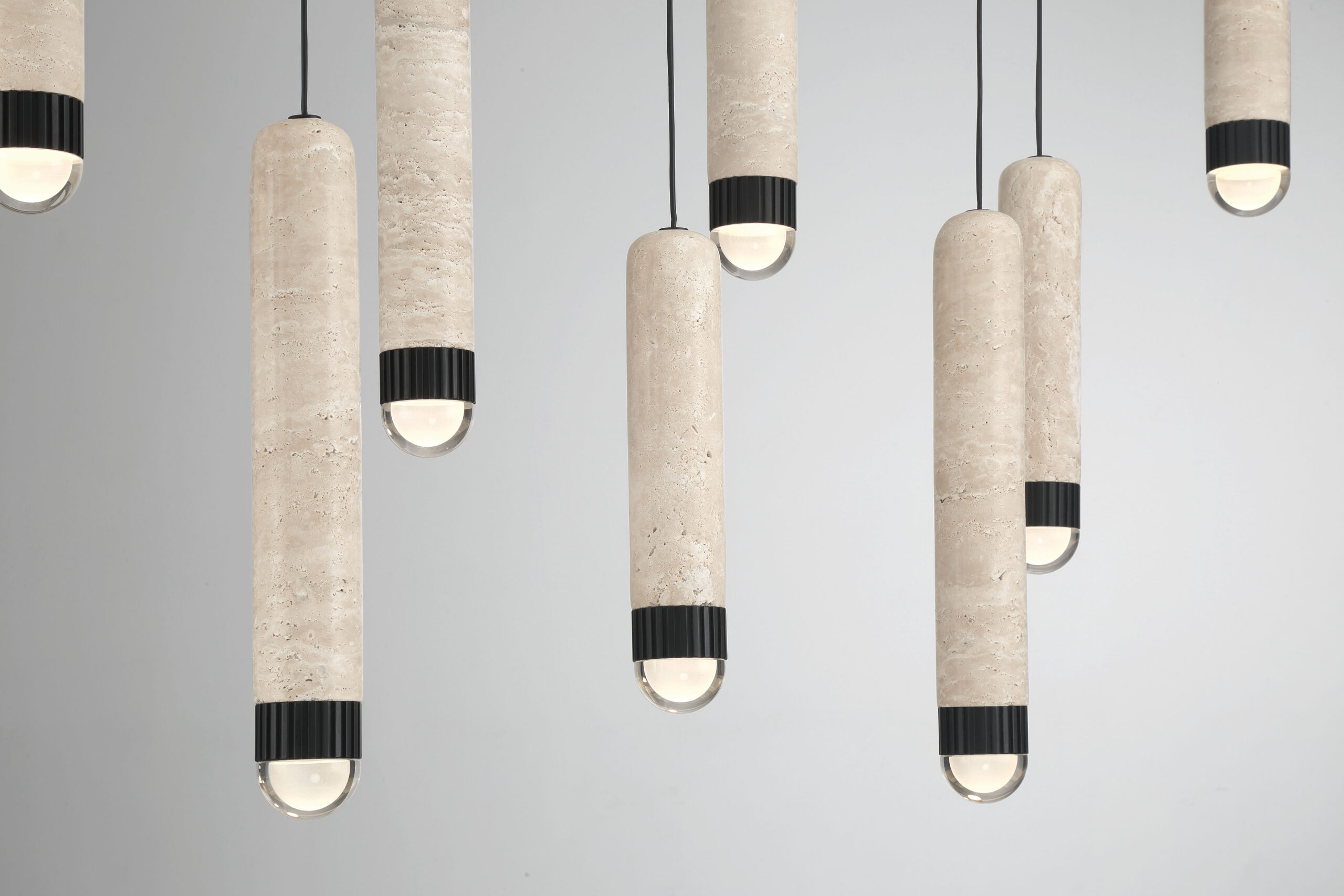Travertine is shaped into clean vertical cylinders where every pore andtonal shift becomes part of the design. Concealed illumination grazes the stone, revealing depth through texture rather than surface shine. A precise crystal element directs light downward, introducing a gentle halo that feels atmospheric. When grouped, Cambre creates a subtle cadence of stone and light that feels both organic and intentional.