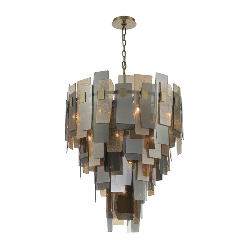 Hand-cut, naturally colored glass in the Cocolina collection creates one-of-a-kind pieces. Because of its natural tinting process, the colors are not all exact, providing a range of smoke and amber hues which further adds to its uniqueness. With its intricate detailing of the hand-pressed glass, the light emits a captivating warmth from within.