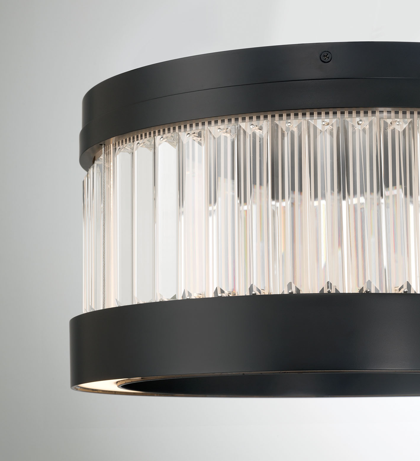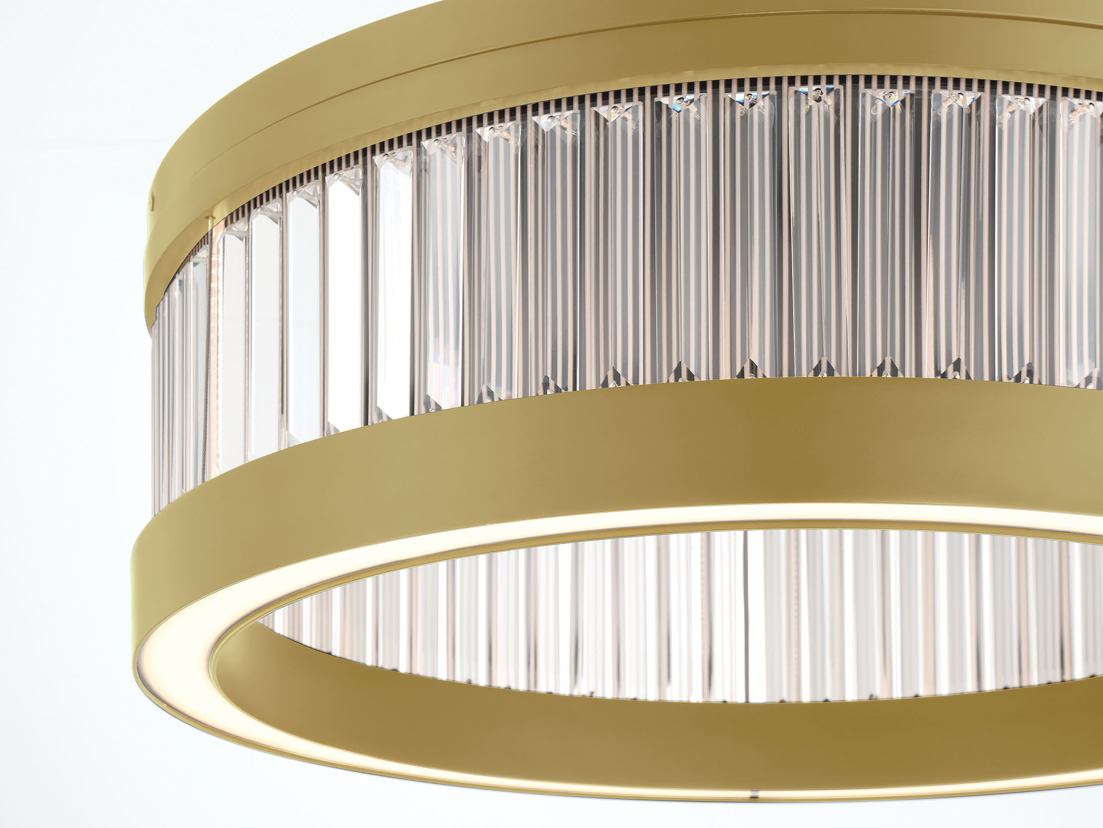 Precision becomes poetry through a series of stepped aluminum rings wrapped in hand-placed crystal. As you move through the space, light shifts and sparkles in quiet motion, revealing new facets from every angle. A concealed internal glow animates the crystal from within, while layered diffusion beneath each tier introduces soft ambient balance. Empra brings depth, movement, and unmistakable presence to the room.