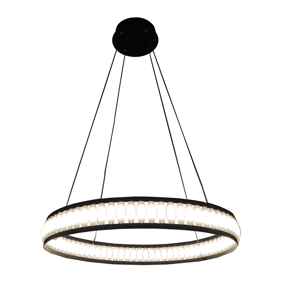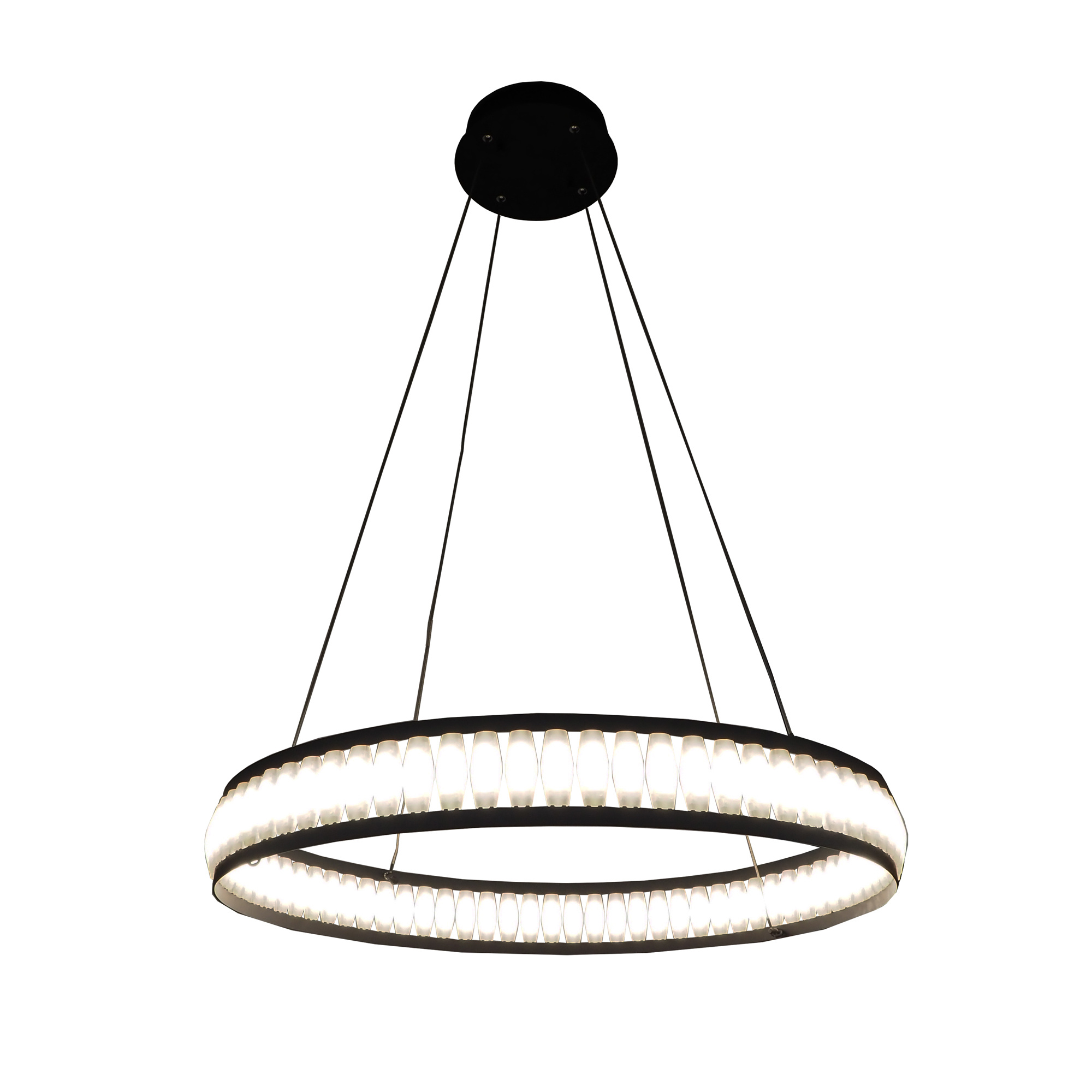 Multiple white acrylic pieces form rings of LED light accented by black trim. The small detail in the halos add dimension and texture to the otherwise simple form. The dark edges create a slight rustic appearance to the overall design adding character and a soft industrial quality. Varied sizing offers 1-tier or 3-tier options