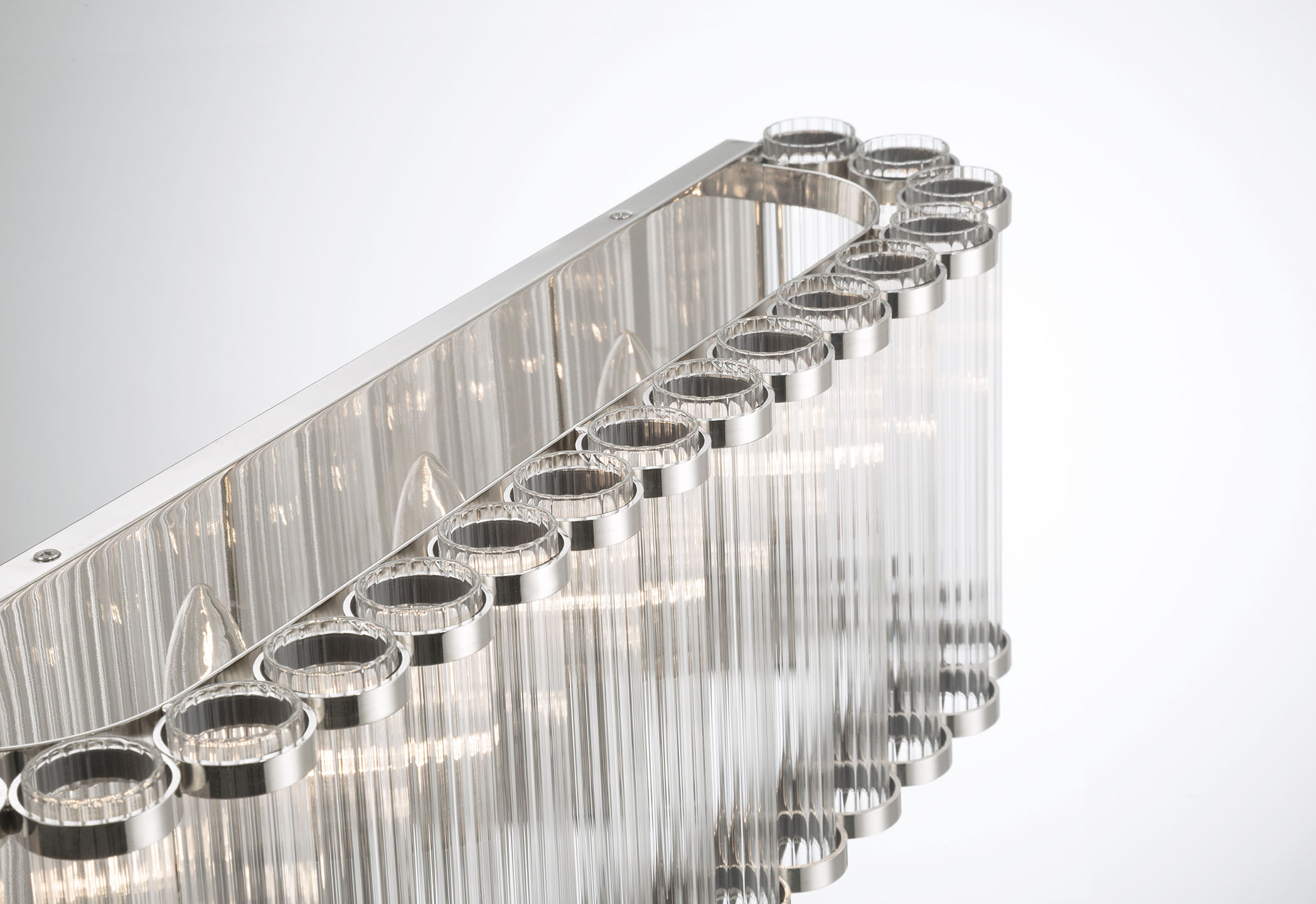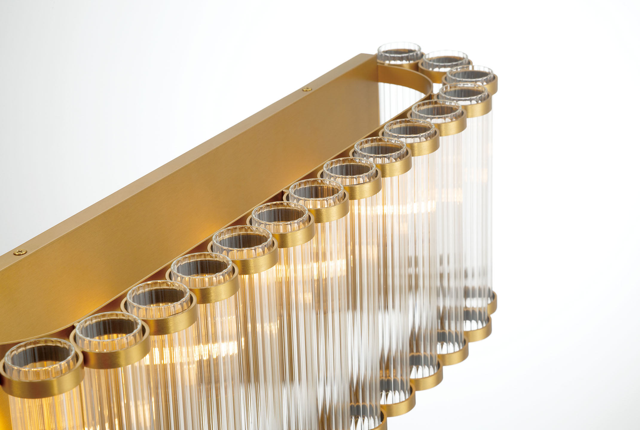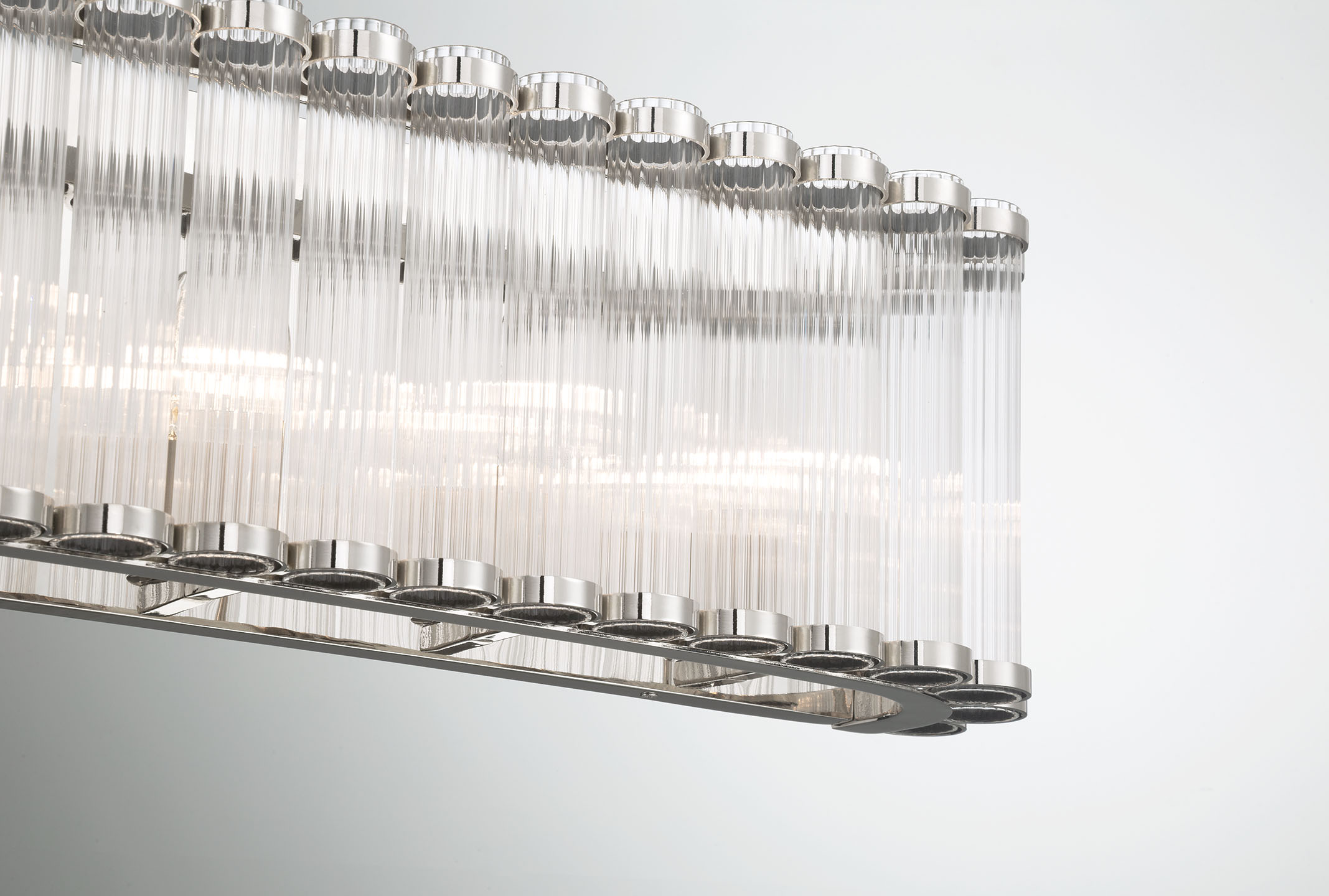 Fluted glass rods rise in a refined circle, each surface softly refracting the light within. The result is a gentle shimmer that animates the ceiling with quiet dimension. Tiered options introduce subtle depth, while tailored metal accents provide balance and structure. Glasbury feels elevated yet familiar, offering composed lighting that settles naturally into the space.