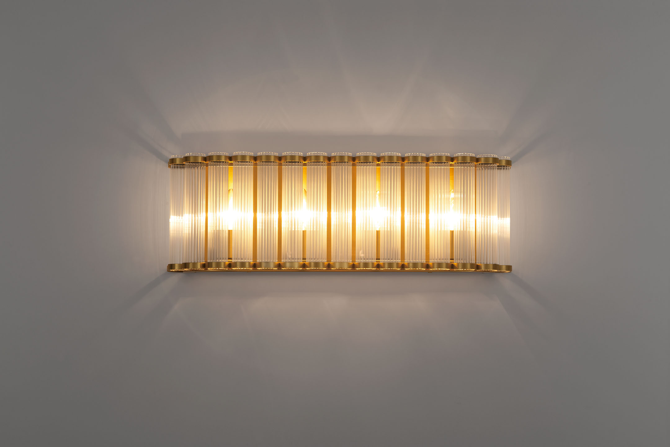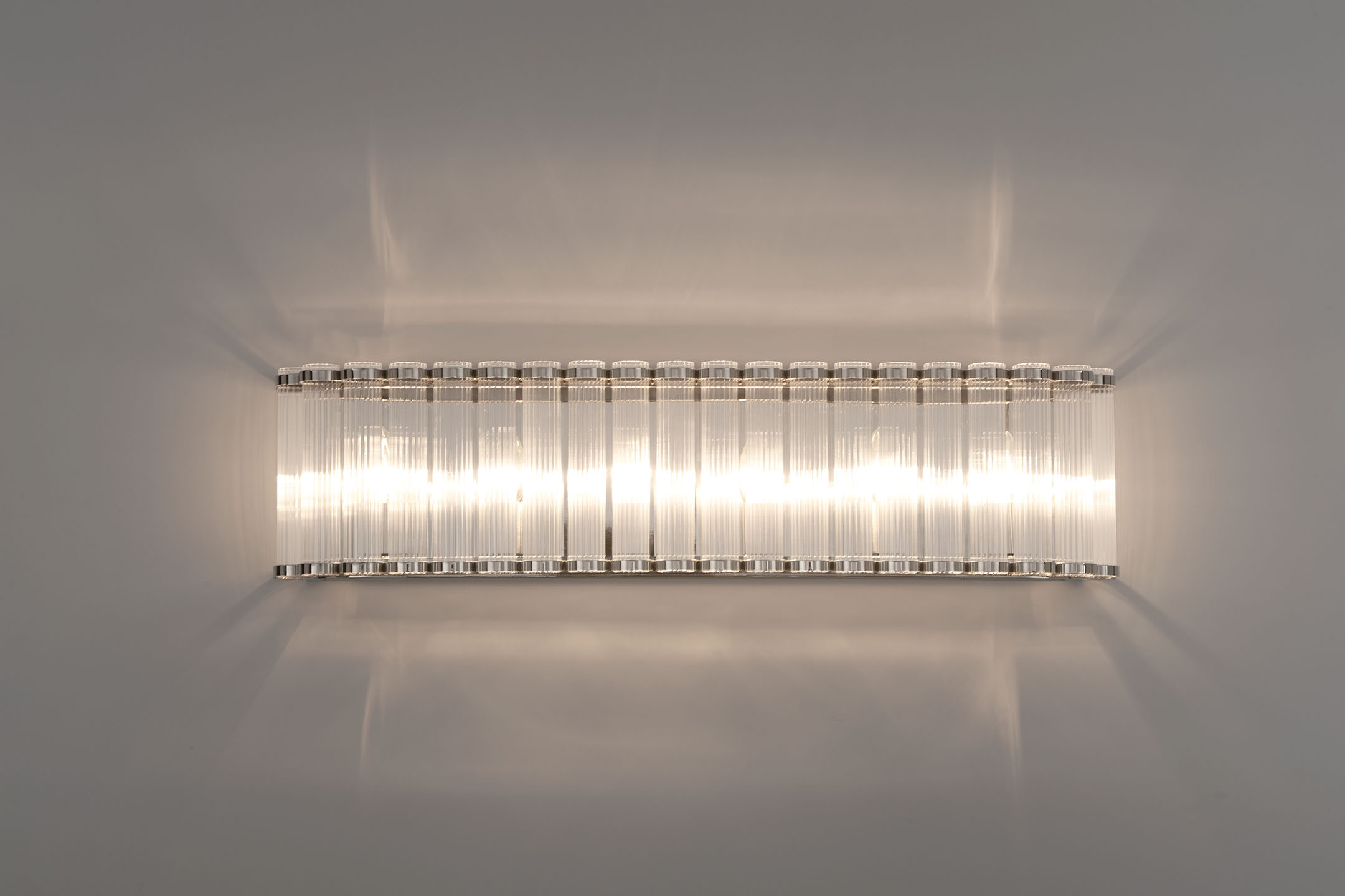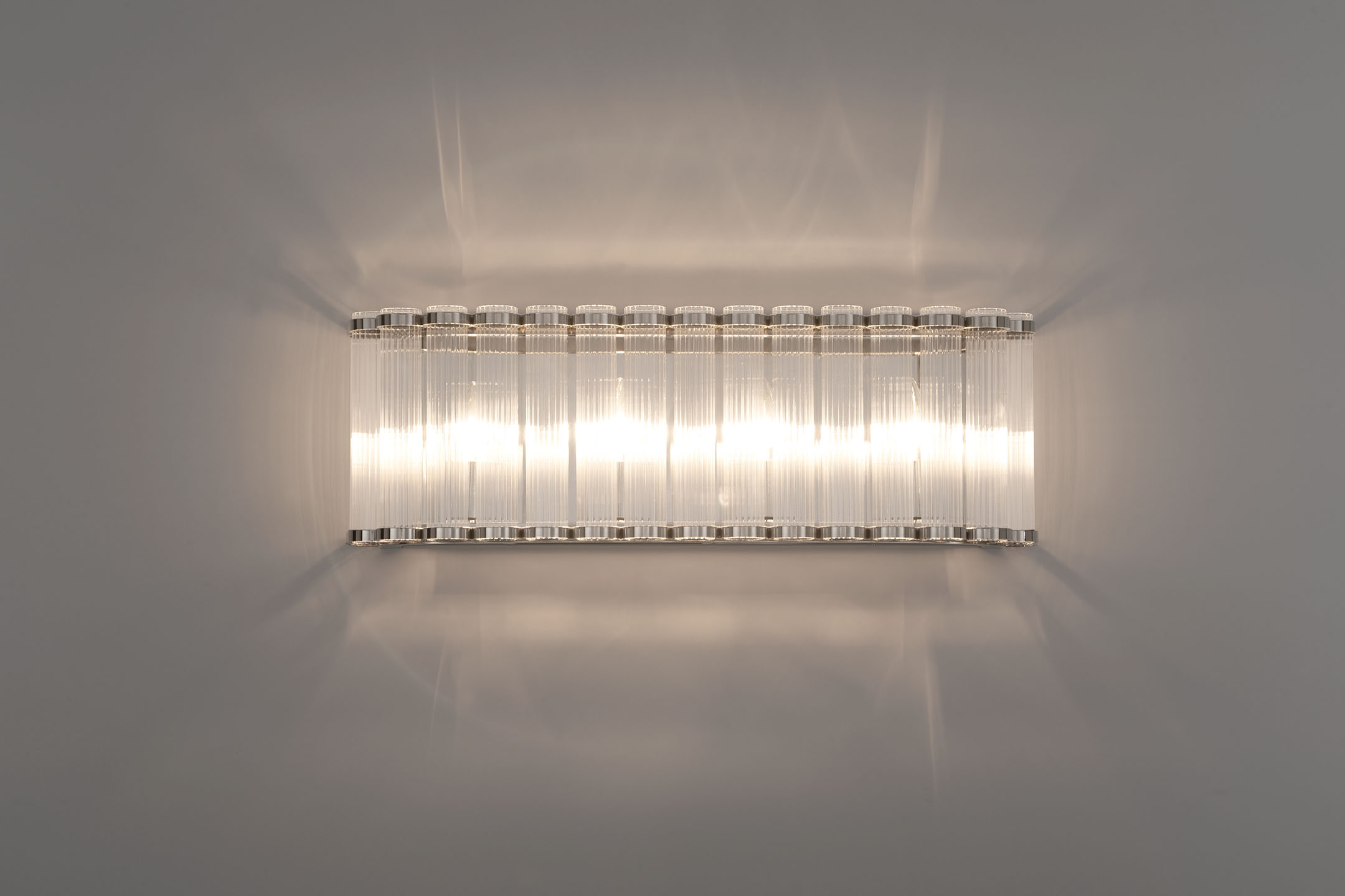 Fluted glass rods rise in a refined circle, each surface softly refracting the light within. The result is a gentle shimmer that animates the ceiling with quiet dimension. Tiered options introduce subtle depth, while tailored metal accents provide balance and structure. Glasbury feels elevated yet familiar, offering composed lighting that settles naturally into the space.