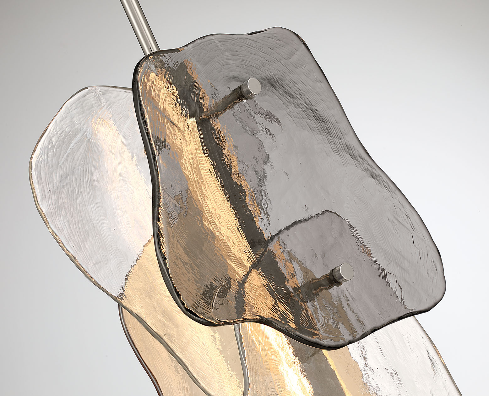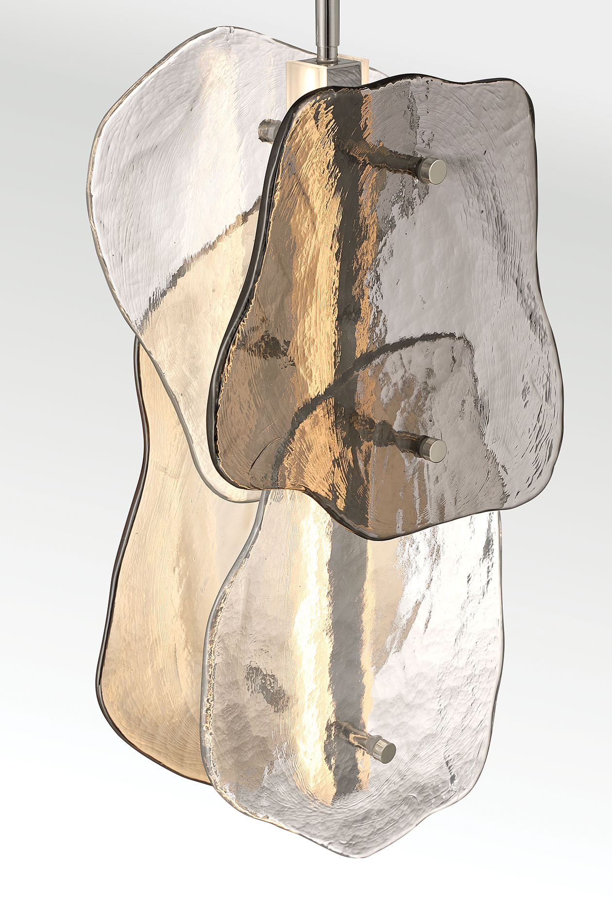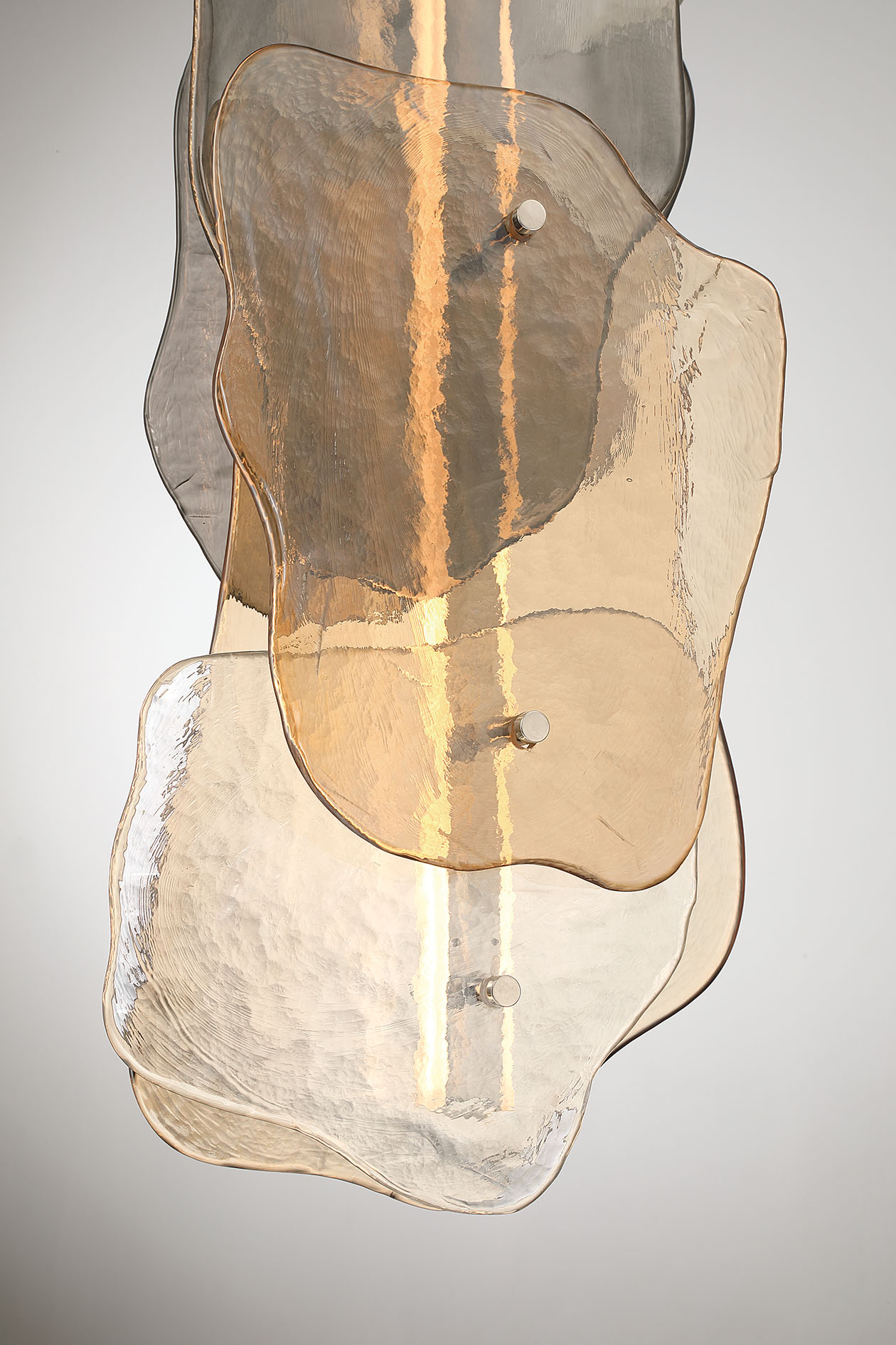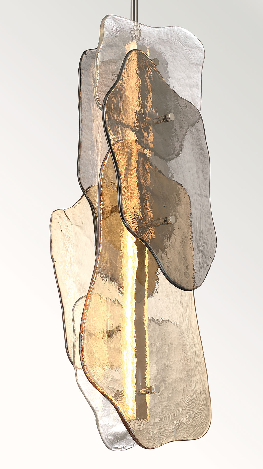 Layered artisan glass forms organic contours that feel shaped by nature. Metallic smoked, amber, and clear tones overlap in soft dimensional shifts, changing character with both daylight and illumination. Light radiates through the glass in gentle gradients, revealing every ripple and layered edge. Grotto feels grounded and elemental, like light filtering through stone and moving water.