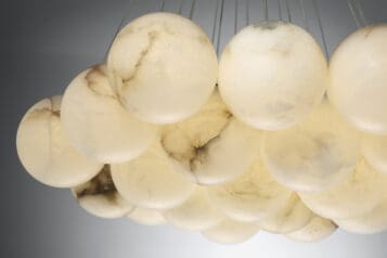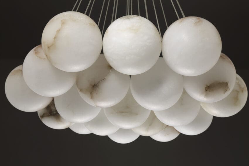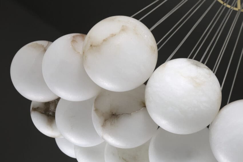 Once illuminated, the stone softens and glows from within. Light moves through it gently, revealing warm undertones, gentle gradients, and the delicate texture hidden inside each globe. It’s more than lighting — it’s a slow burn of atmosphere.