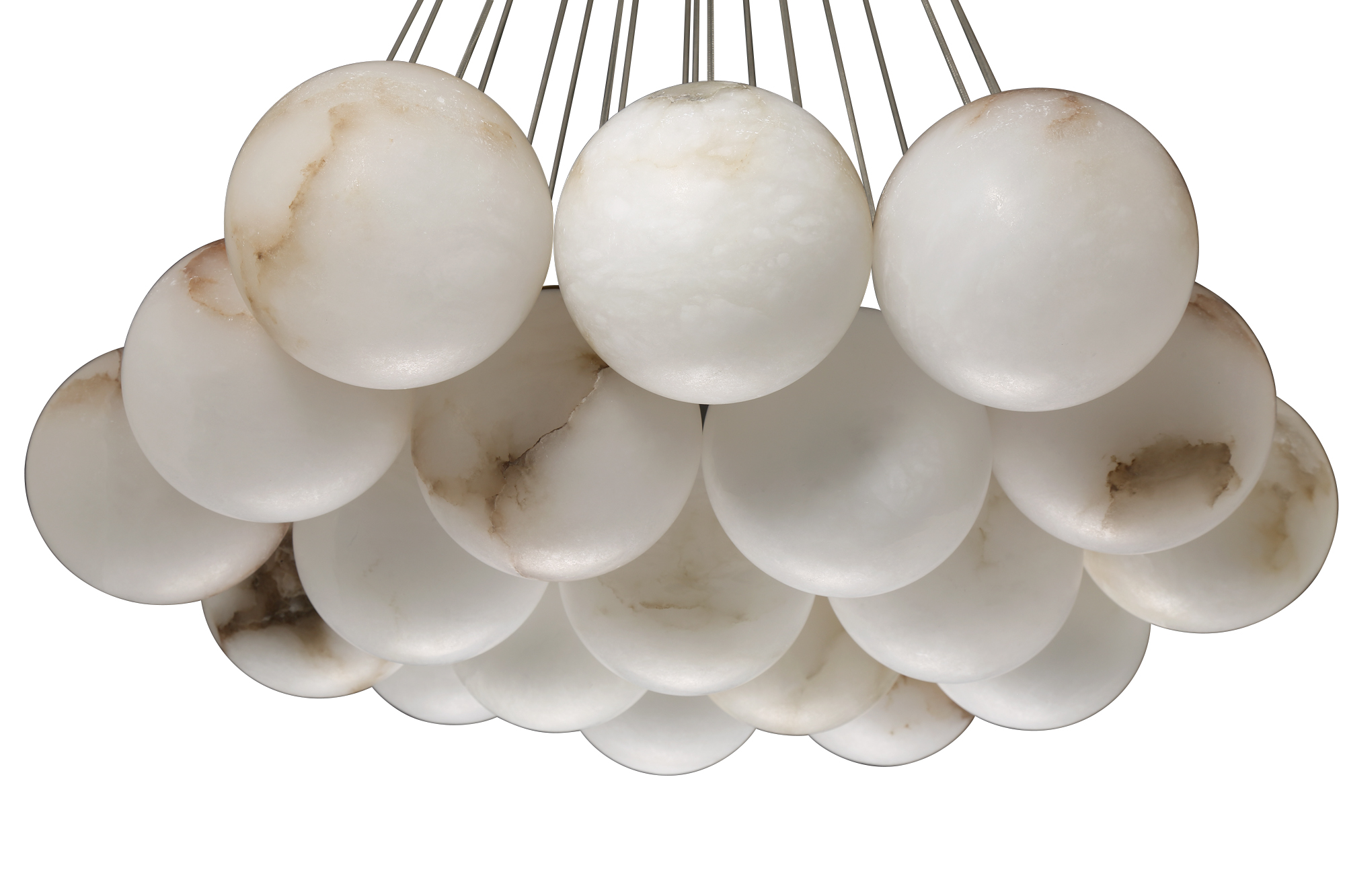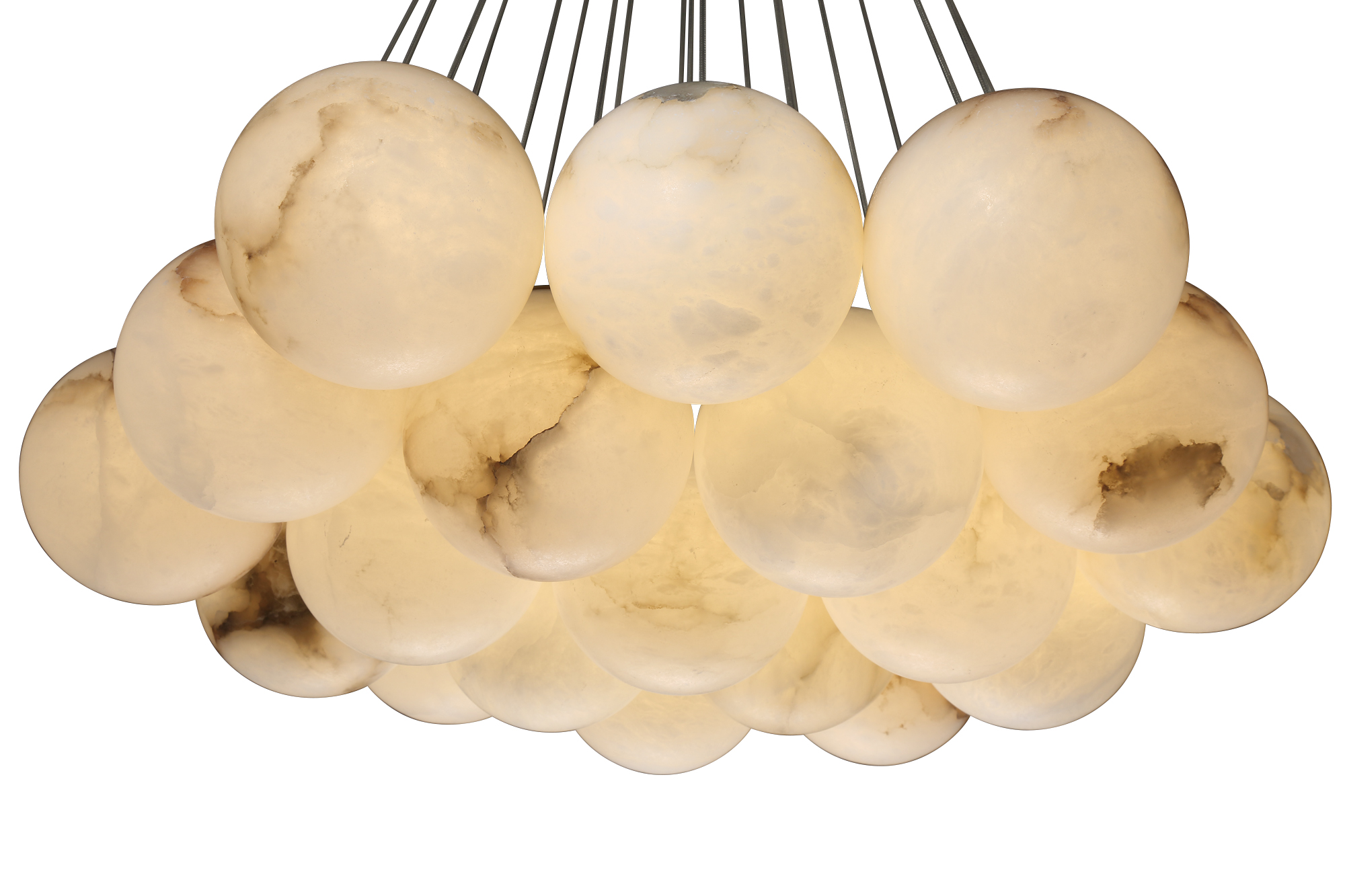 Crafted from cored blocks of alabaster, these pendants and chandeliers harness the organic beauty of calcite stone. Iron oxide deposits form trails and clouds within the smooth curves, revealing the unpredictable artistry of nature.