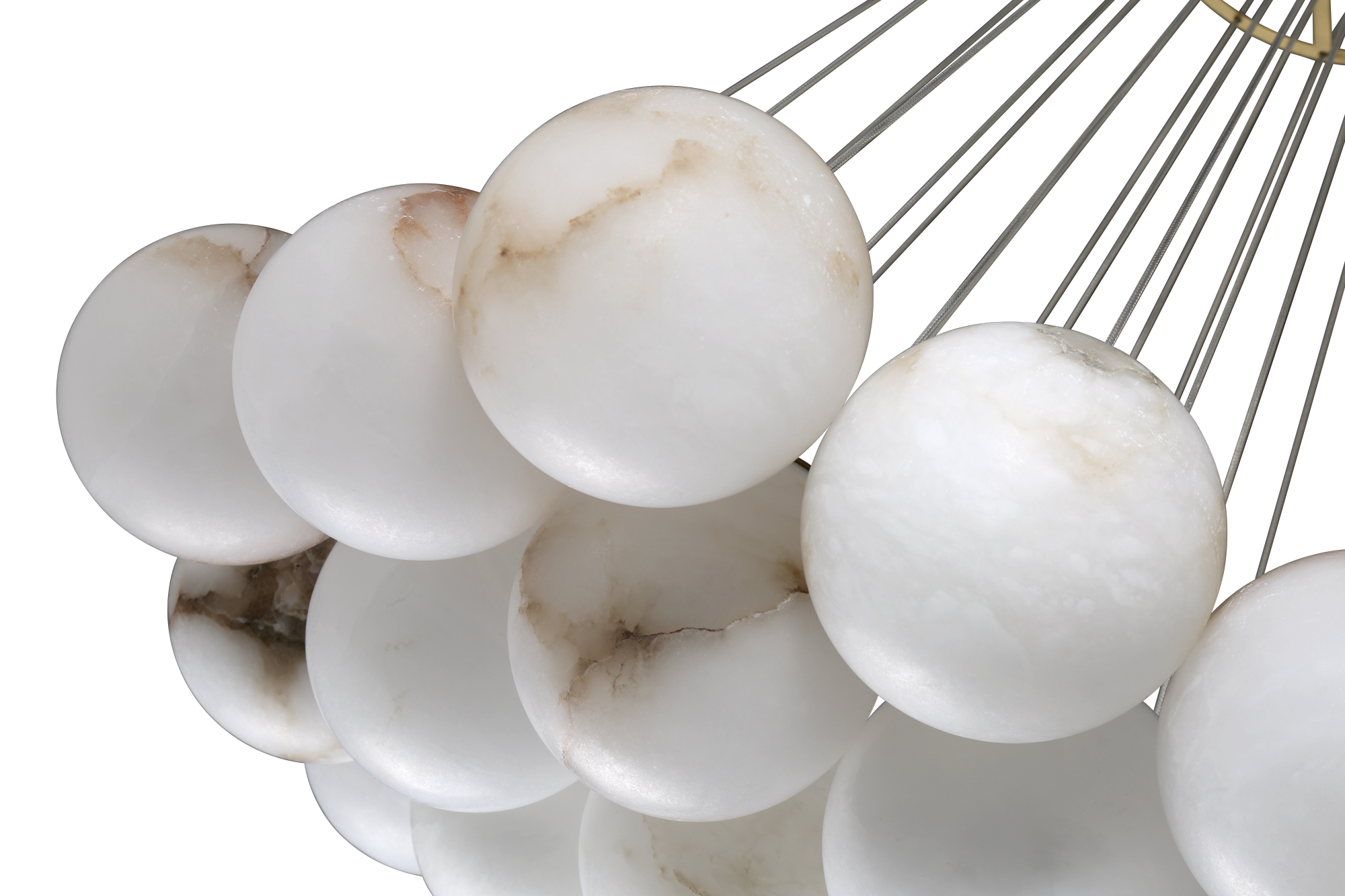 Suspended in a refined Gold finish, Kepler’s minimalist structure lets the material speak for itself. Its warm metallic tones enhance the natural complexity of the alabaster while staying subtle enough to let the stone remain the focal point.