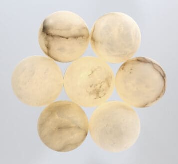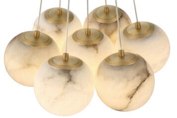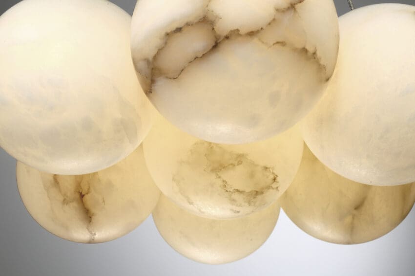 Solid blocks of alabaster stone have been cored and turned into spheres, the naturally occurring deposits of iron oxides in the soft calcite stone leave trails of clouding and veining. Natural alabaster may show variations in color and texture.