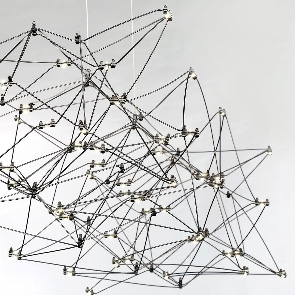 Dozens of twinkling LED lights are placed at the end of fine rods, creating intricate geometric forms that float effortlessly above. This unique source of illumination has a glossy, polished frame available in three sizes to bring a starburst of light to various room settings. Create your own personal star phenomenon indoors with the Leonardelli collection that glimmers and shines remarkably