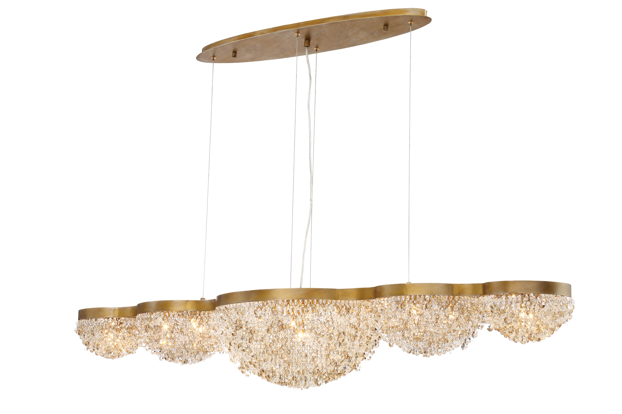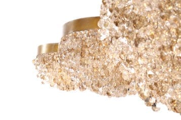 Antique gold netting weaves together octagonal crystal beads that accentuate a warm inviting tone to this collection. The clustered crystals form domes that wrap around the light, amplifying the shimmering curtain above.