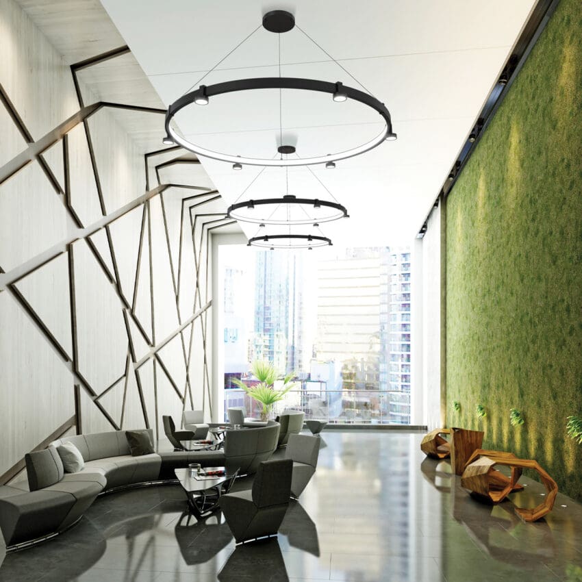 A new custom system for lighting, the minimalist Mucci collection features a black aluminum body in round and rectangular options to bring a sleek, contemporary design to multiple environments. Integrated LED lighting is built into the fixture frame to create one unified piece, with the option for an inner or outer glow in the circular chandeliers. Mucci is fully customizable with multiple light modules that can be easily attached to a copper power rail above the black aluminum frame for tailored directional lighting.