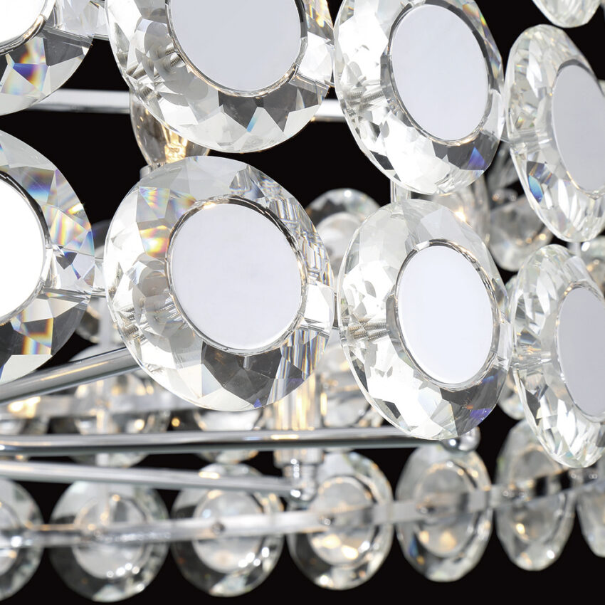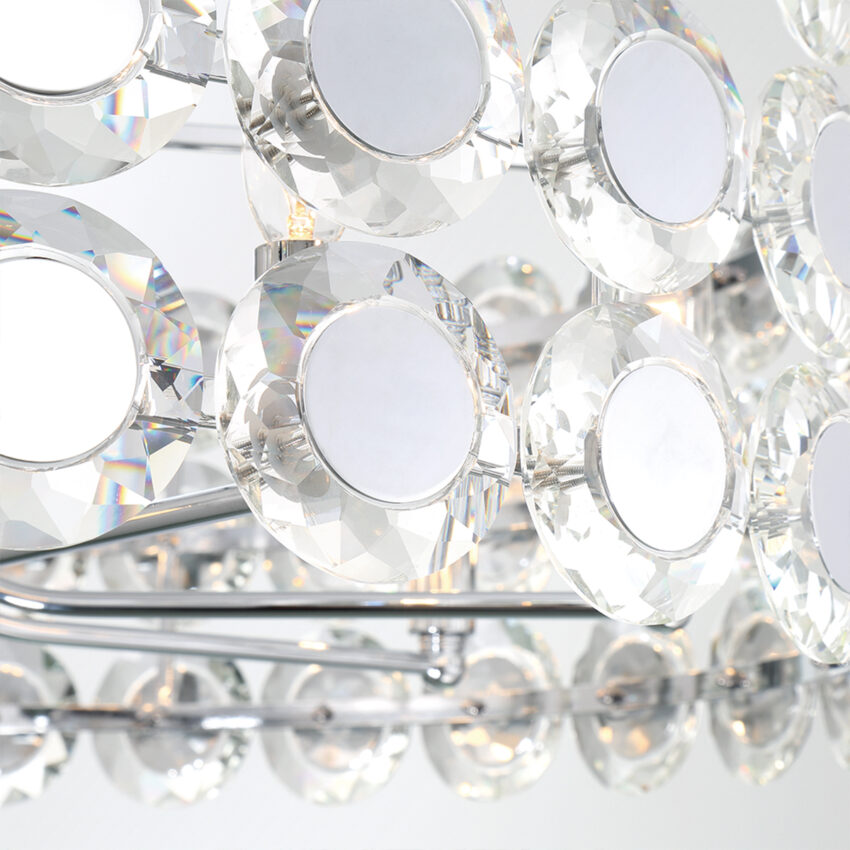 Our lavish Perrene collection is a true statement piece; ordained with coveted crystals, both sides showcase bevelled texture that brings dramatic elegance. The mirrored chrome center helps reflect the light for an even more opulent display of light. Indulge with the Perrene collection today.