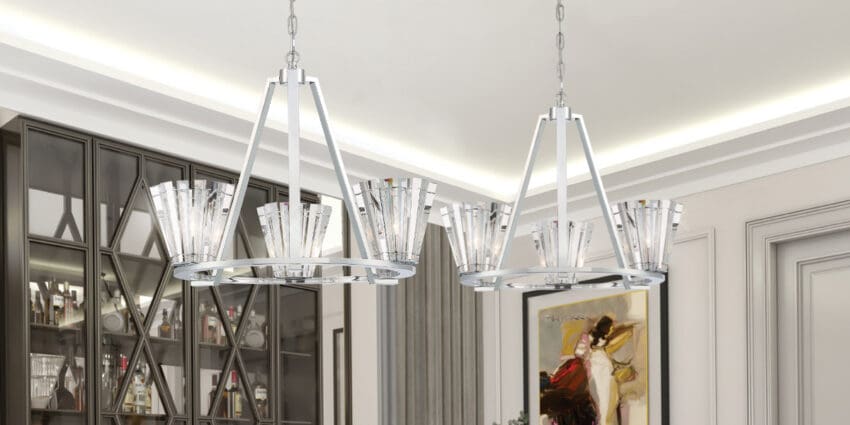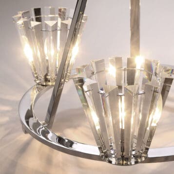 Individual crystal prisms encircle a chrome ring, creating a tapered form for each shade. The clear crystals with their high quality brilliance embellish this collection extravagantly. Create a glamorous setting with the dazzling display of lights that are refracted from the crystals and polished chrome.
