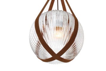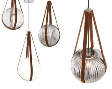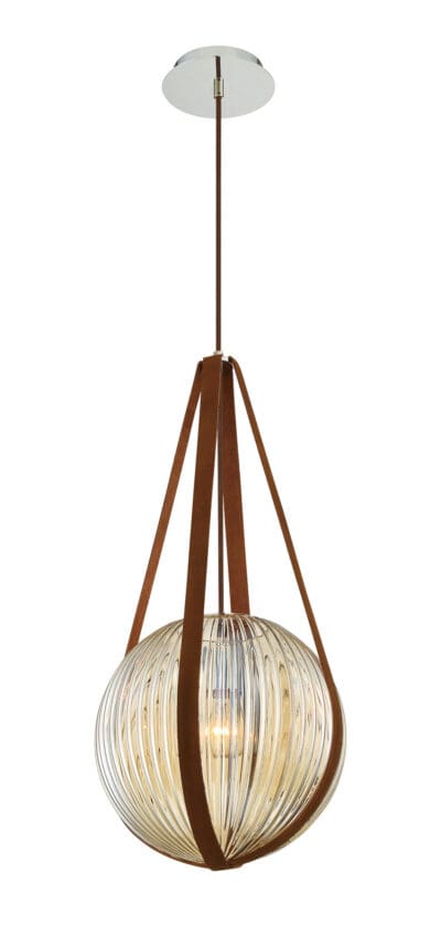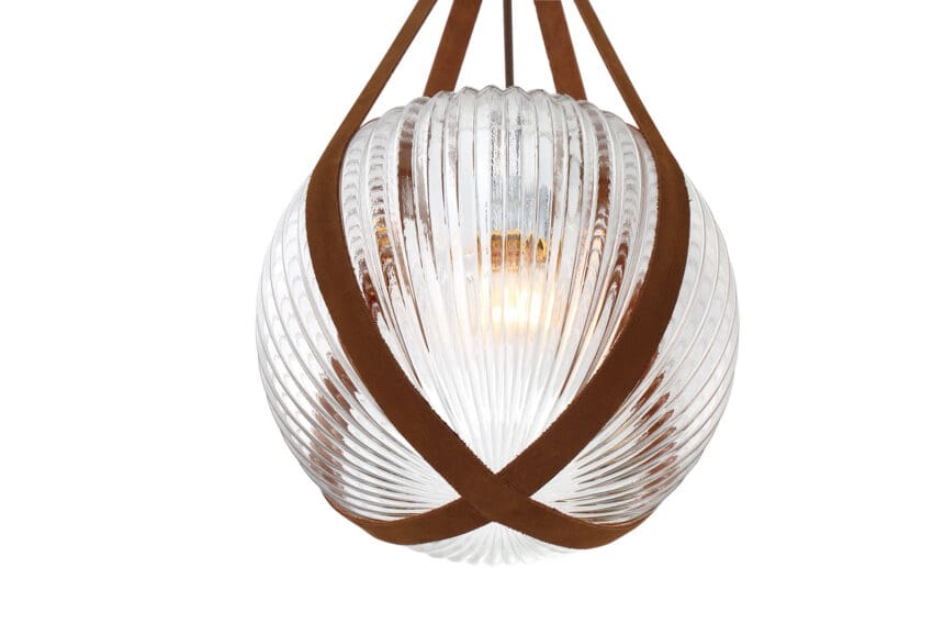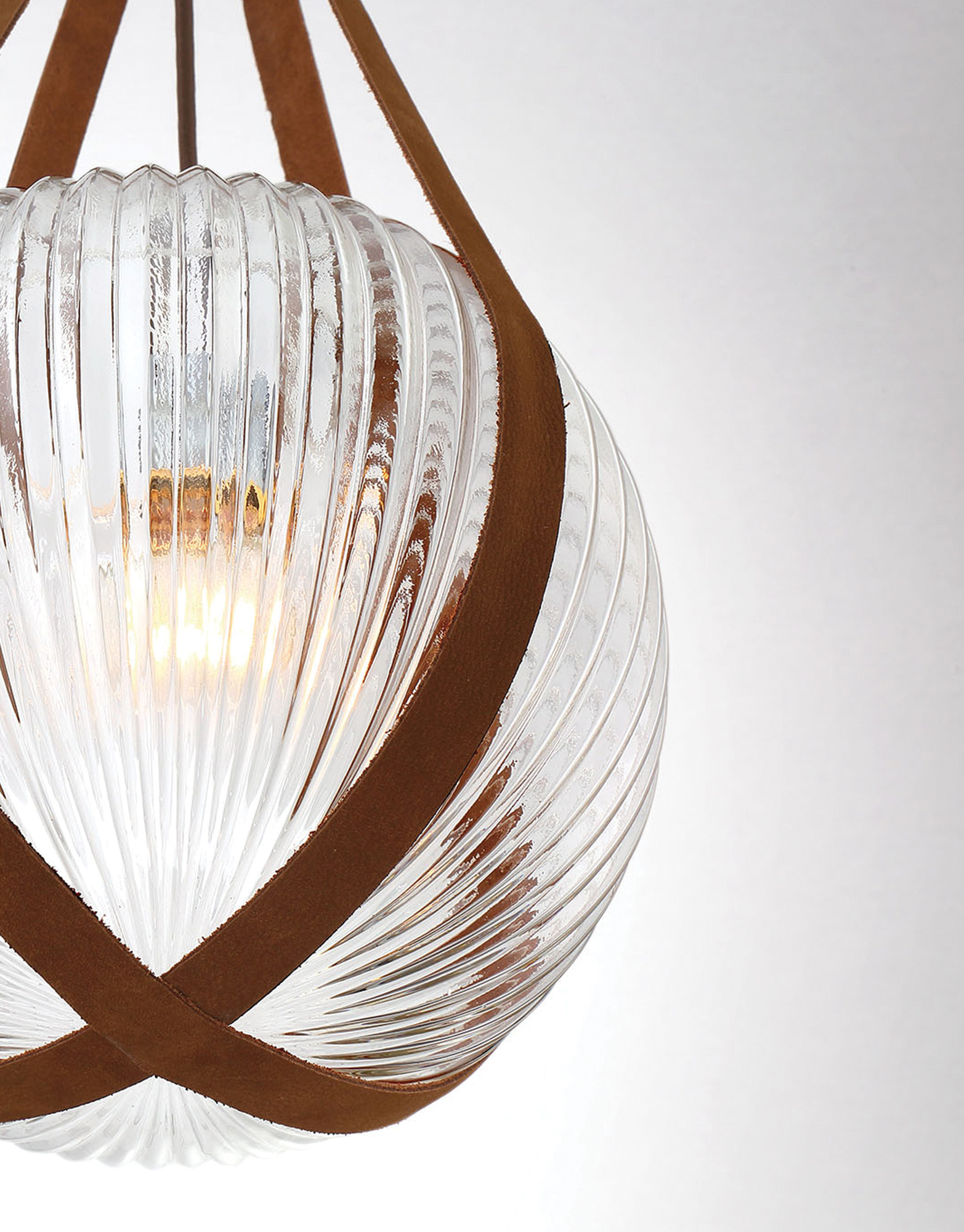 A pendulous glass orb supported by real leather straps offers the illusion of an effortless balancing act. Whether in clear ribbed glass, smoke colored ribbed glass, or opal smooth glass, this remarkable spherical pendant is sure to make an impression.