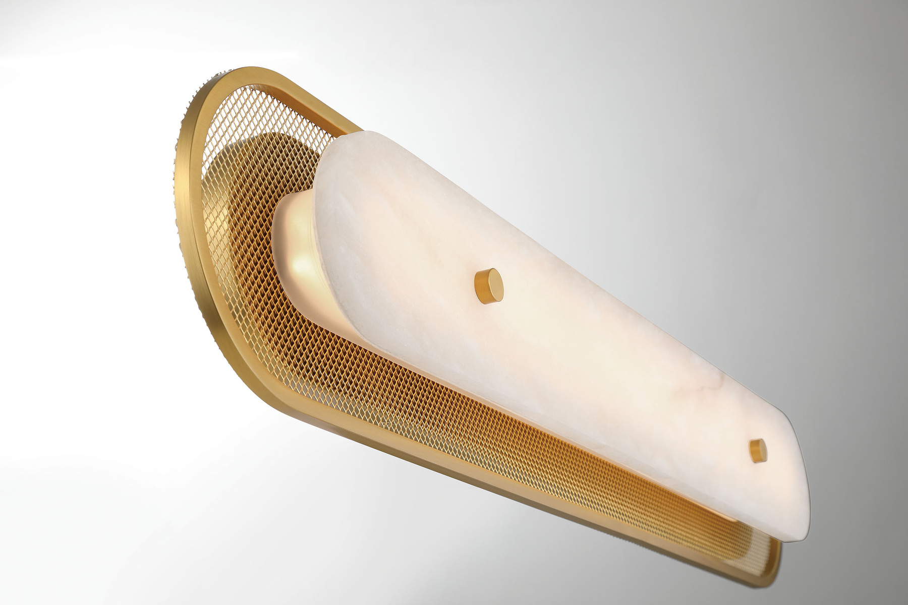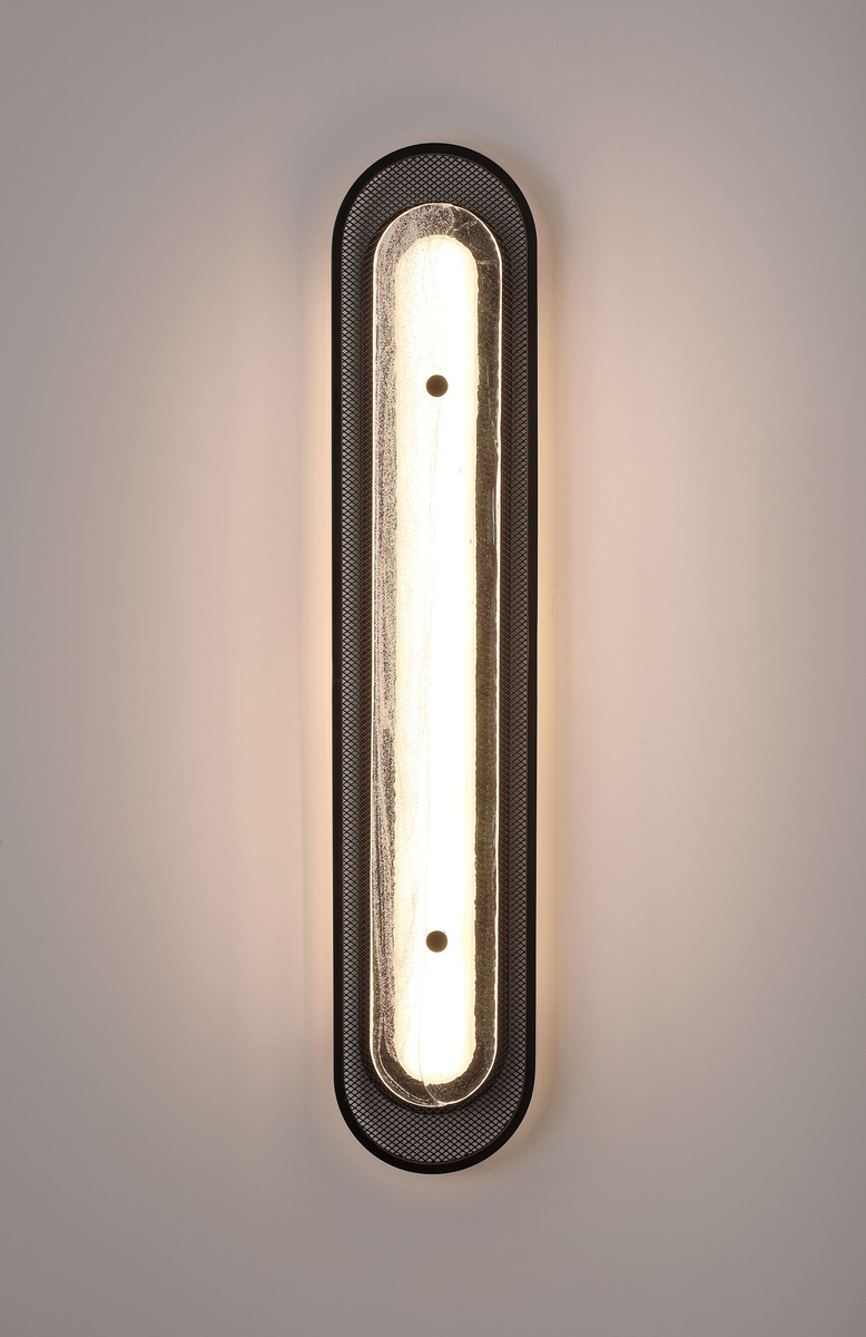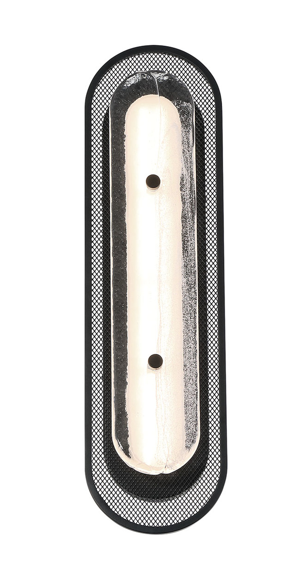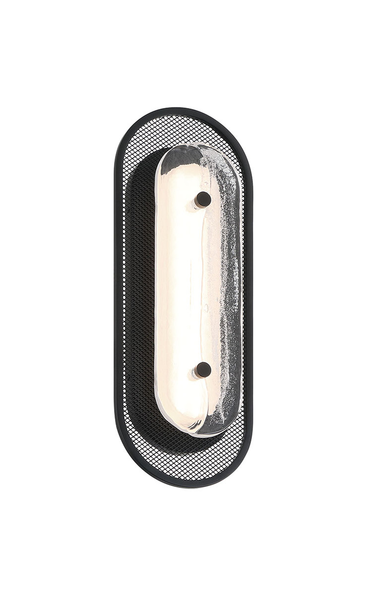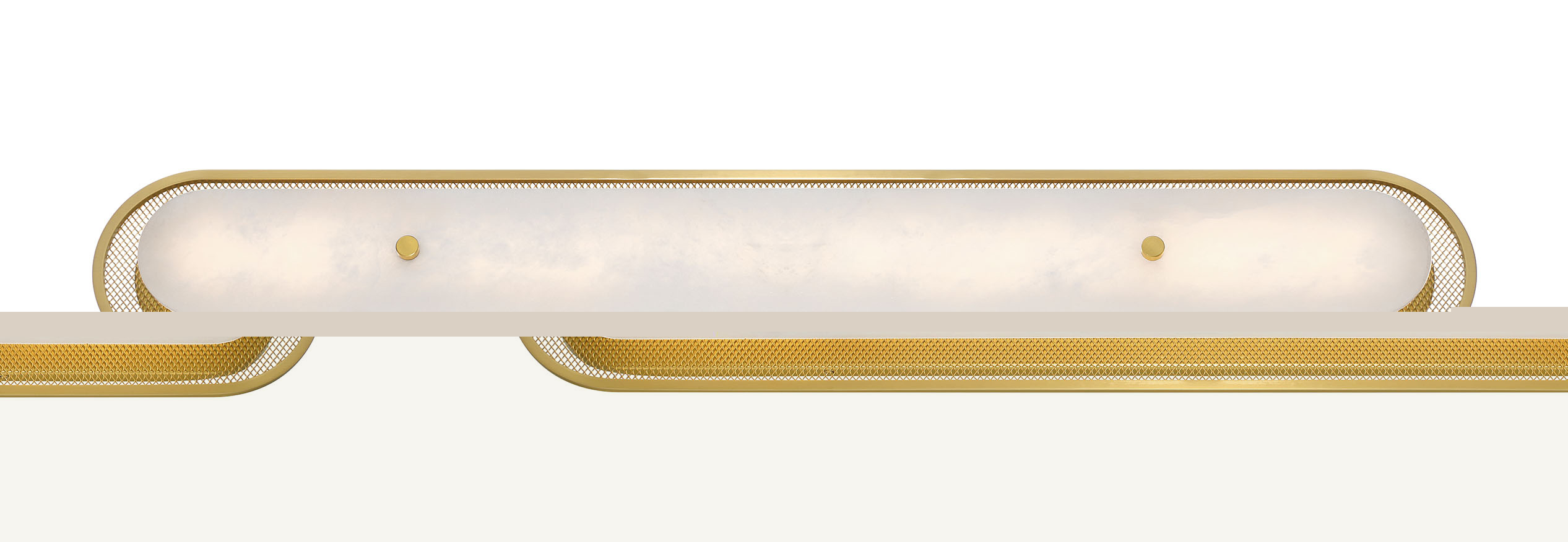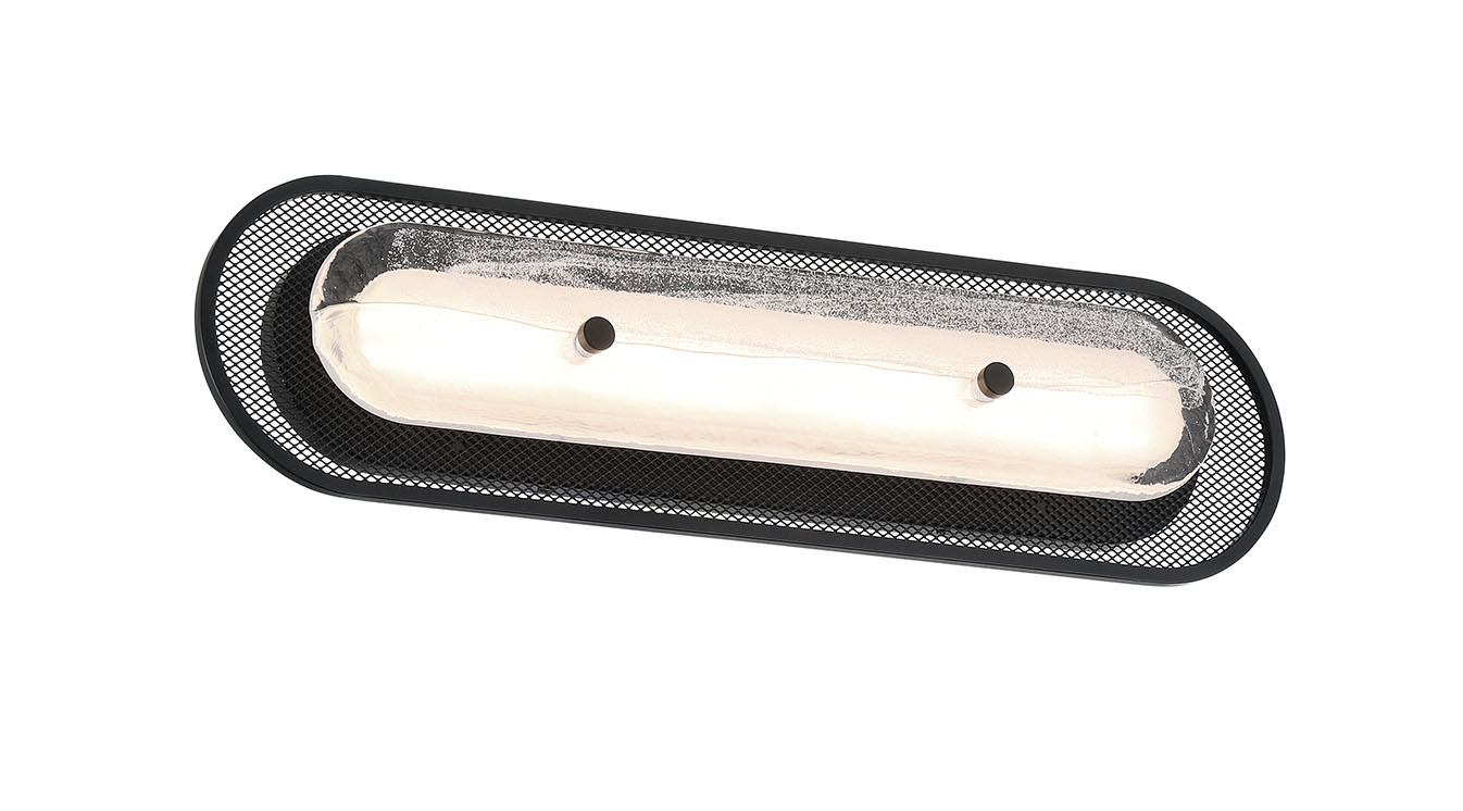A modern mesh backplate surrounds the uniform LED light source, casting delicate, patterned shadows on the mounting surface. This interaction of light and material adds depth and visual interest to the fixture’s clean lines.