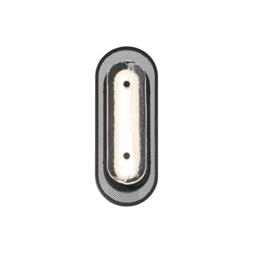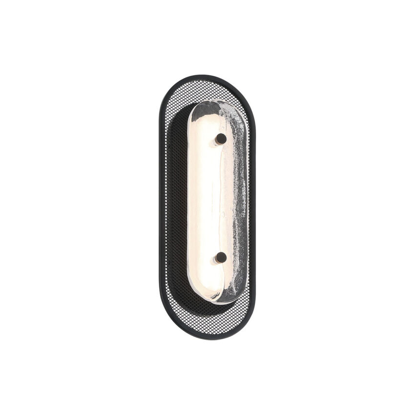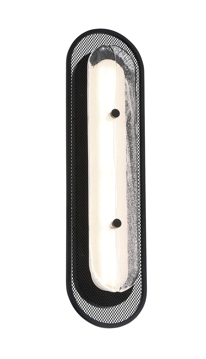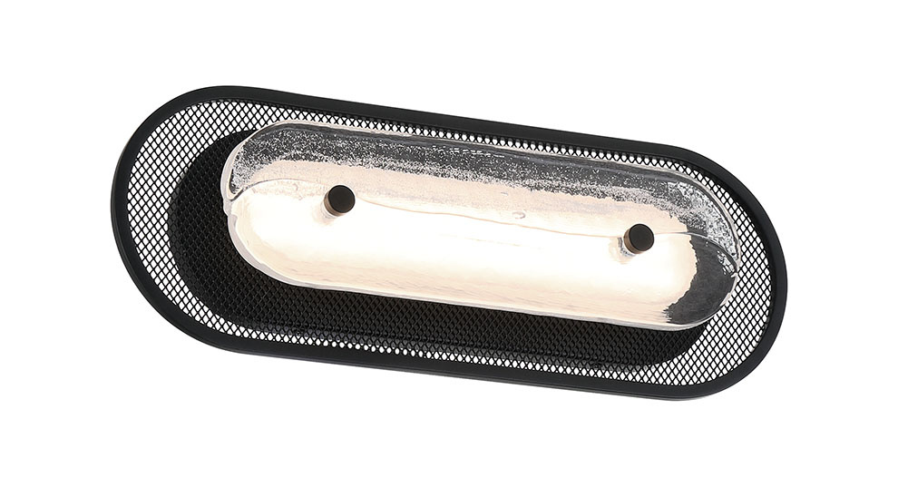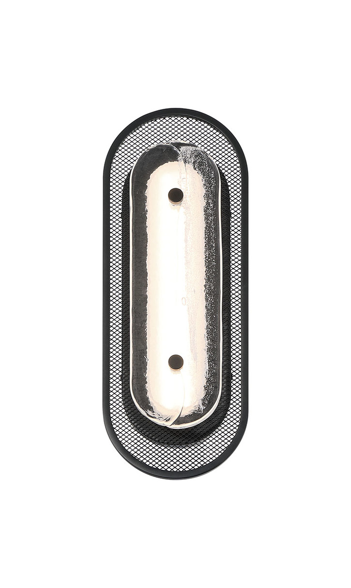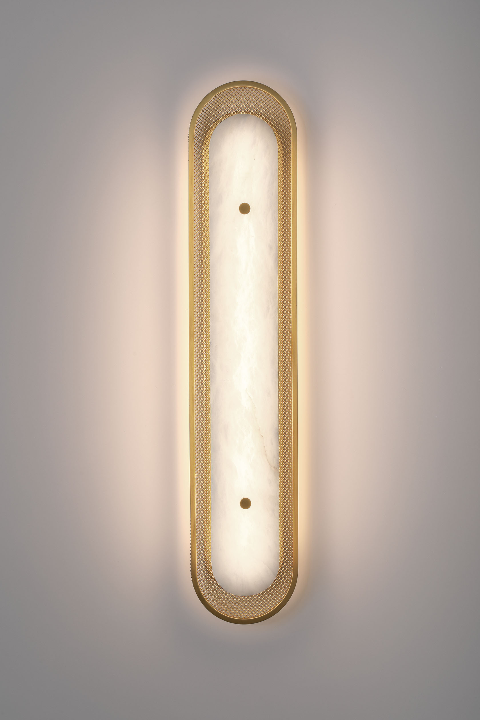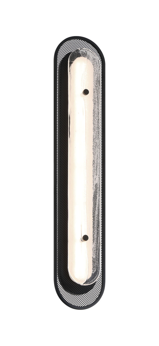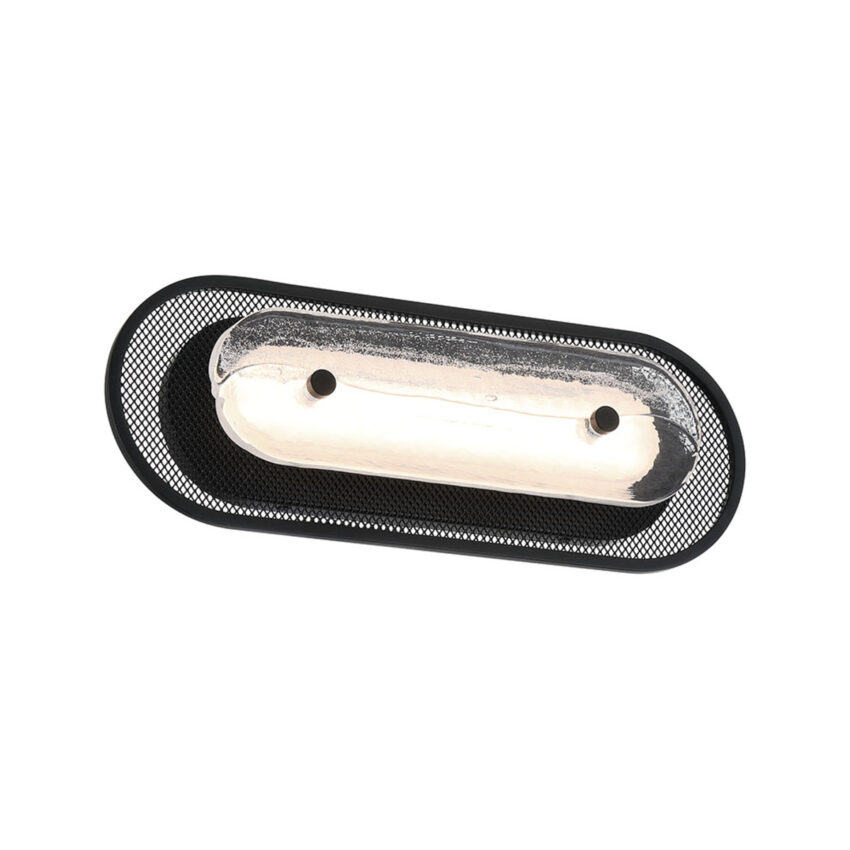 A modern mesh backplate surrounds the uniform LED light source, casting delicate, patterned shadows on the mounting surface. This interaction of light and material adds depth and visual interest to the fixture’s clean lines.