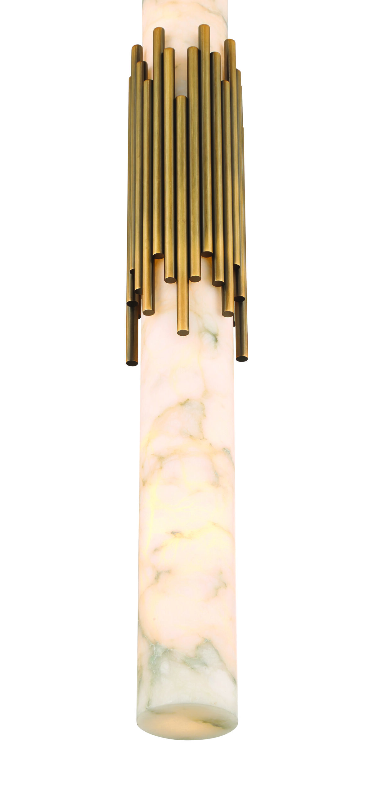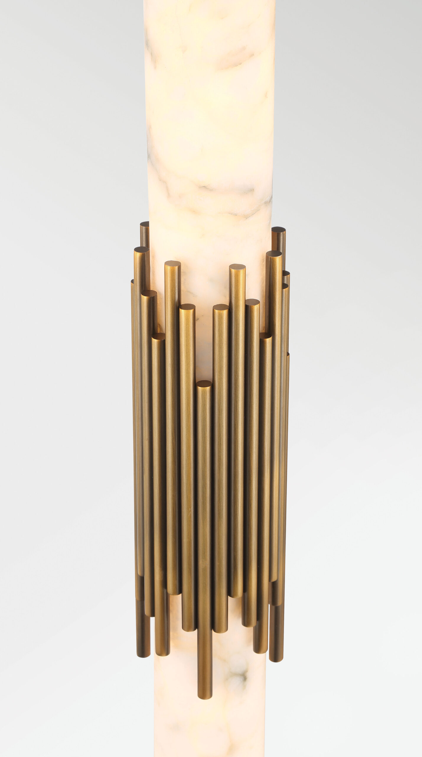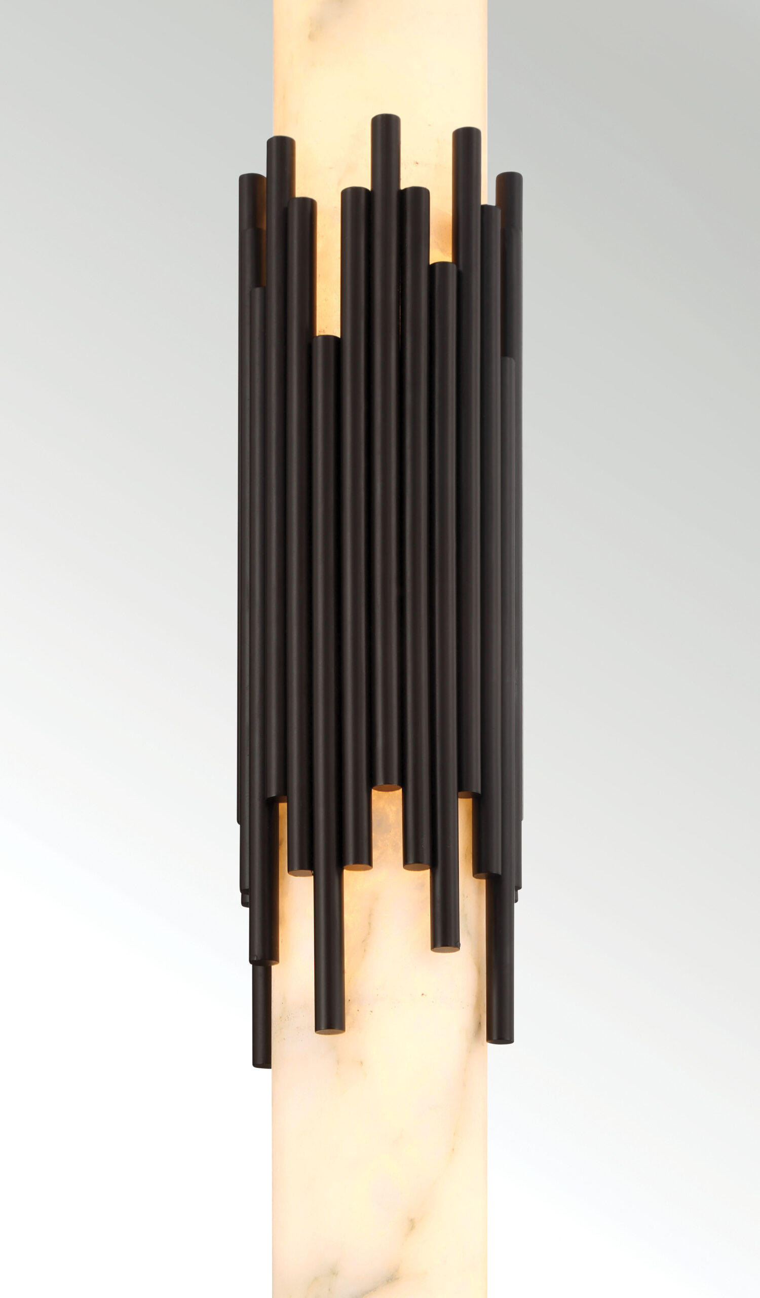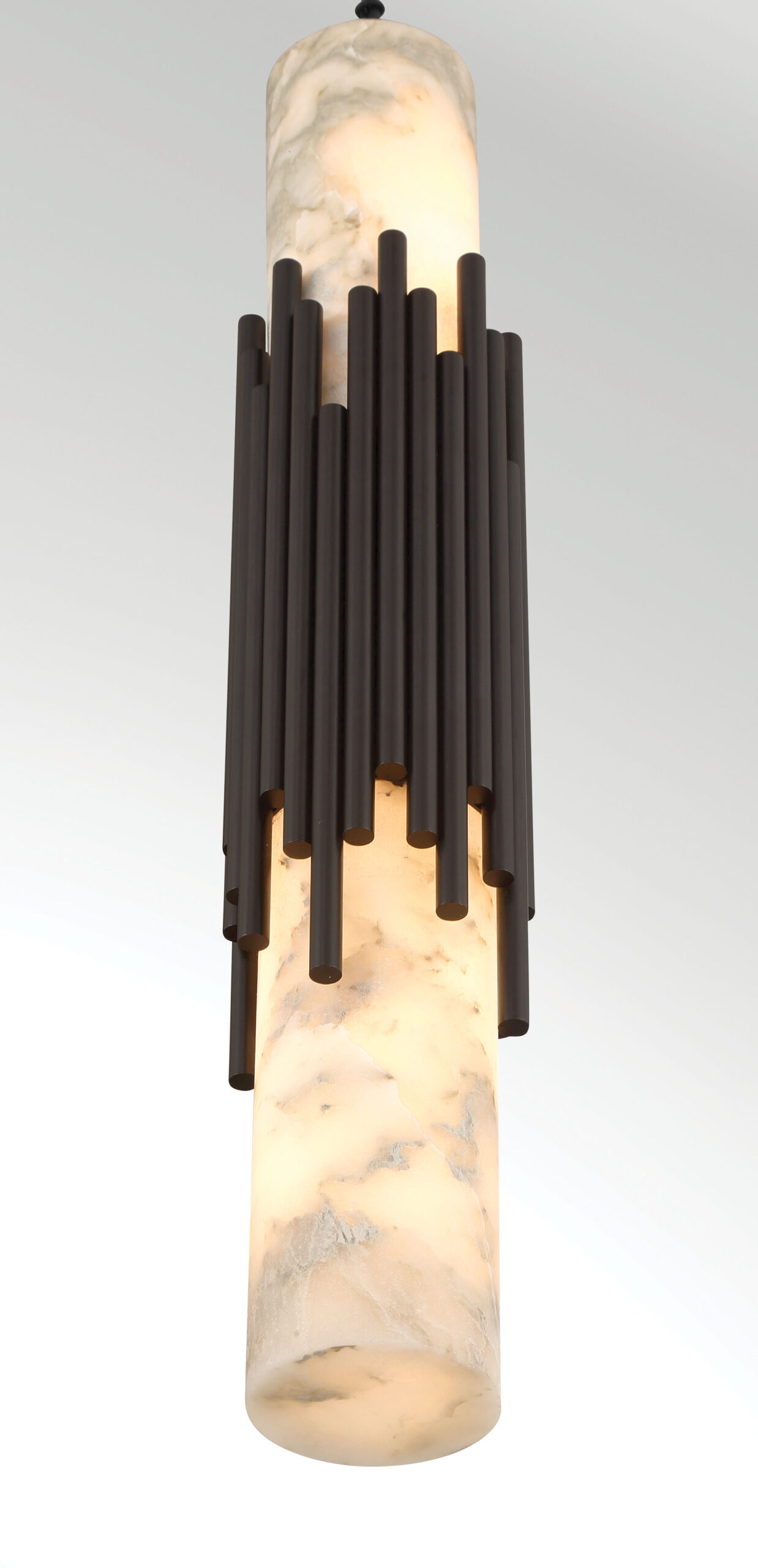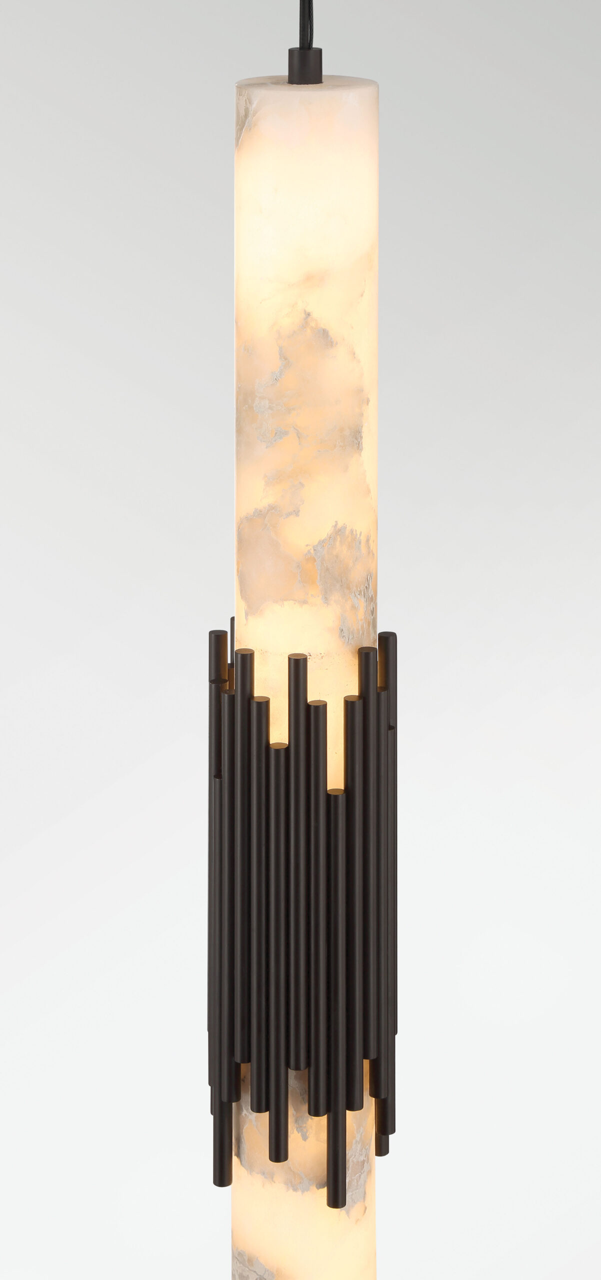 Elongated alabaster glows from within, revealing clouded veining that gives Venna its own quiet identity. Slender metal rods gather at the center with tailored restraint, offering structure without excess. The contrast between organic stone and cast metal creates a vertical rhythm that feels calm and refined.