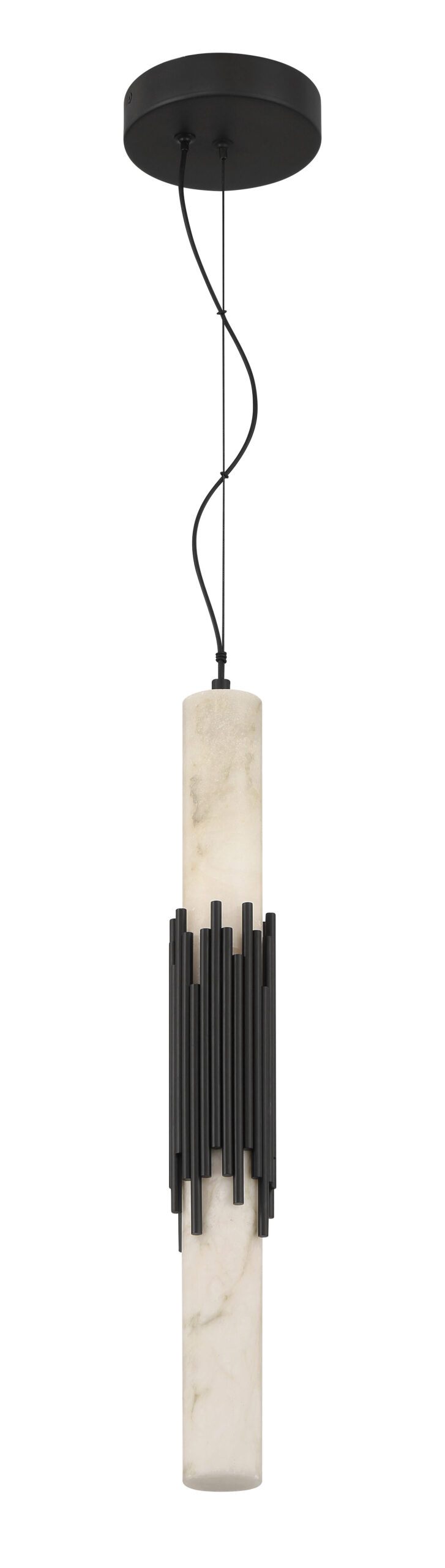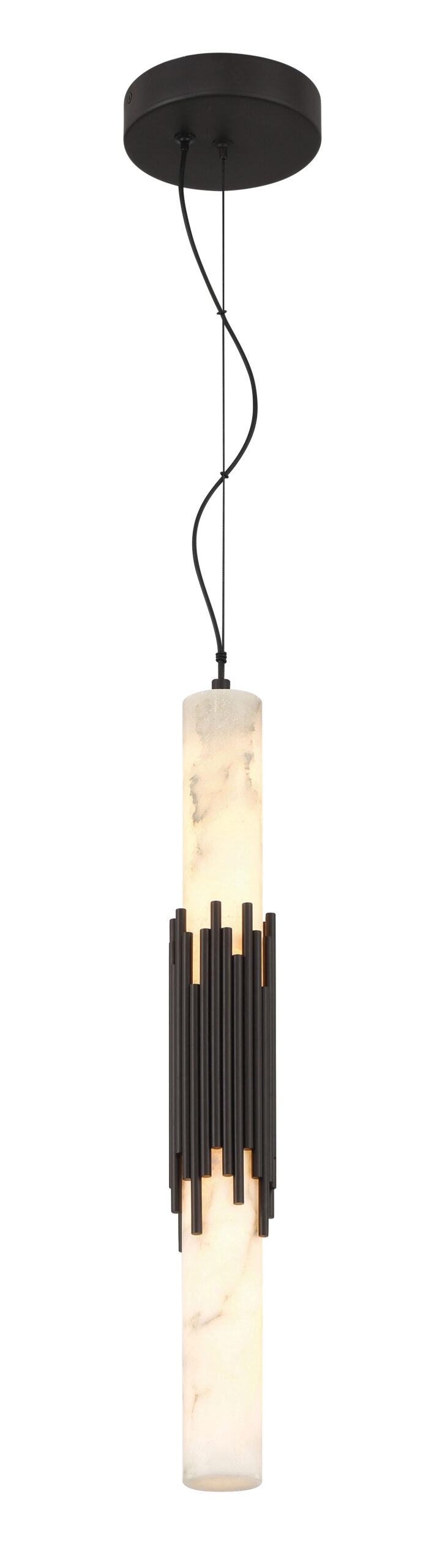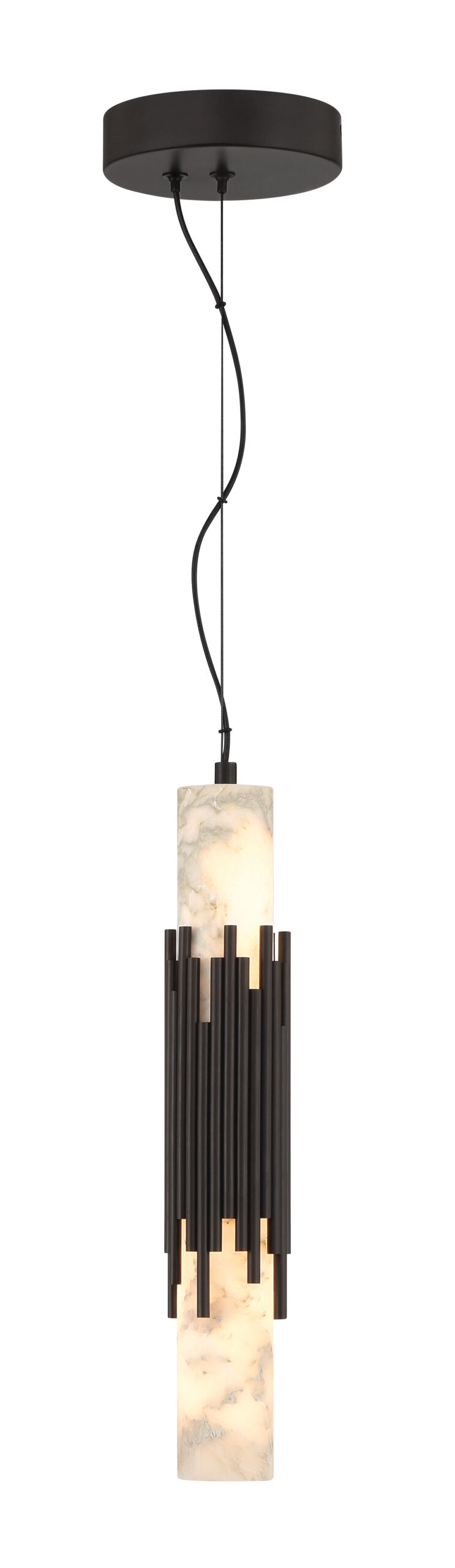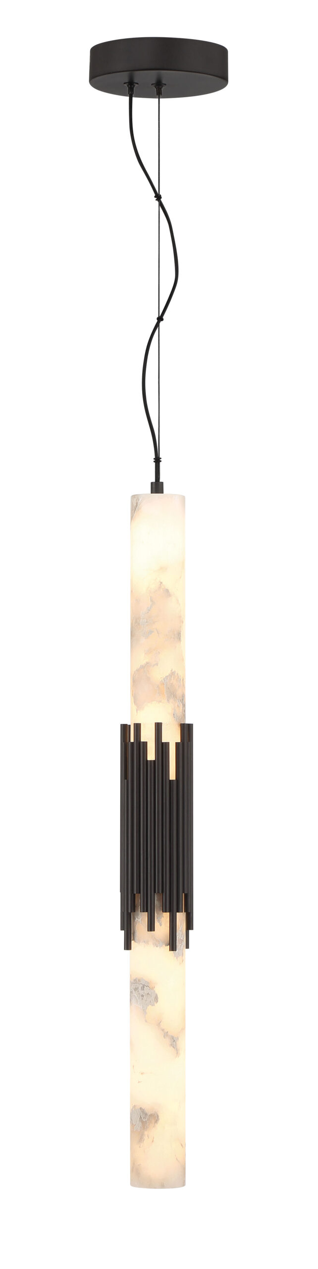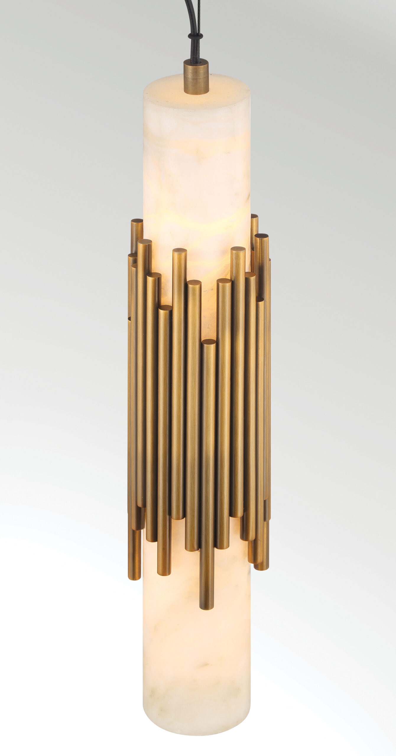 Elongated alabaster glows from within, revealing clouded veining that gives Venna its own quiet identity. Slender metal rods gather at the center with tailored restraint, offering structure without excess. The contrast between organic stone and cast metal creates a vertical rhythm that feels calm and refined.