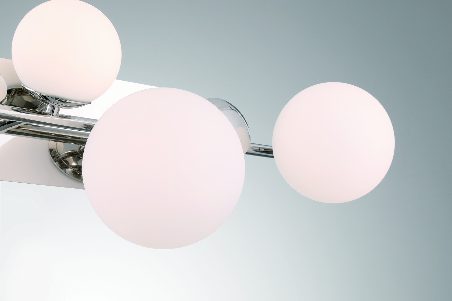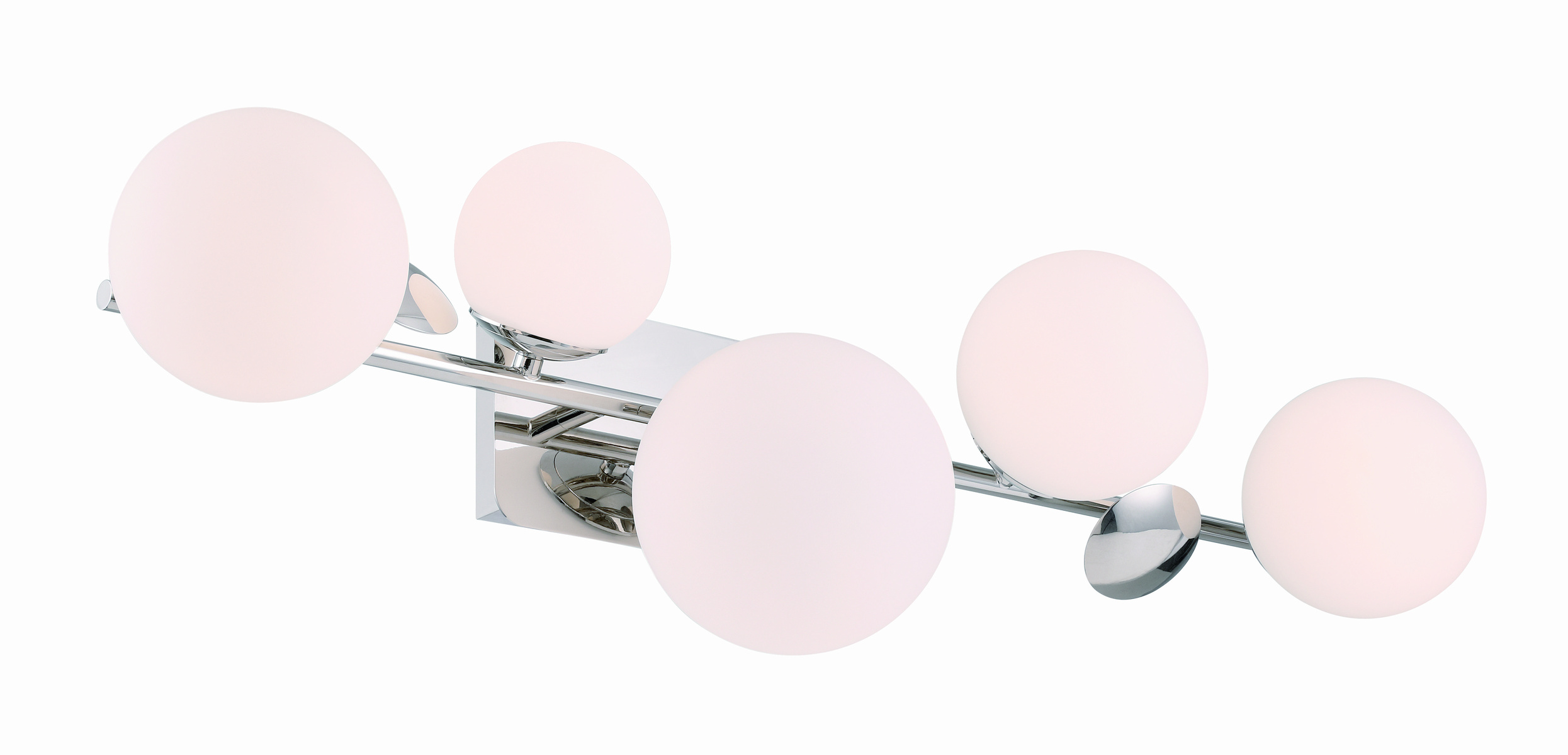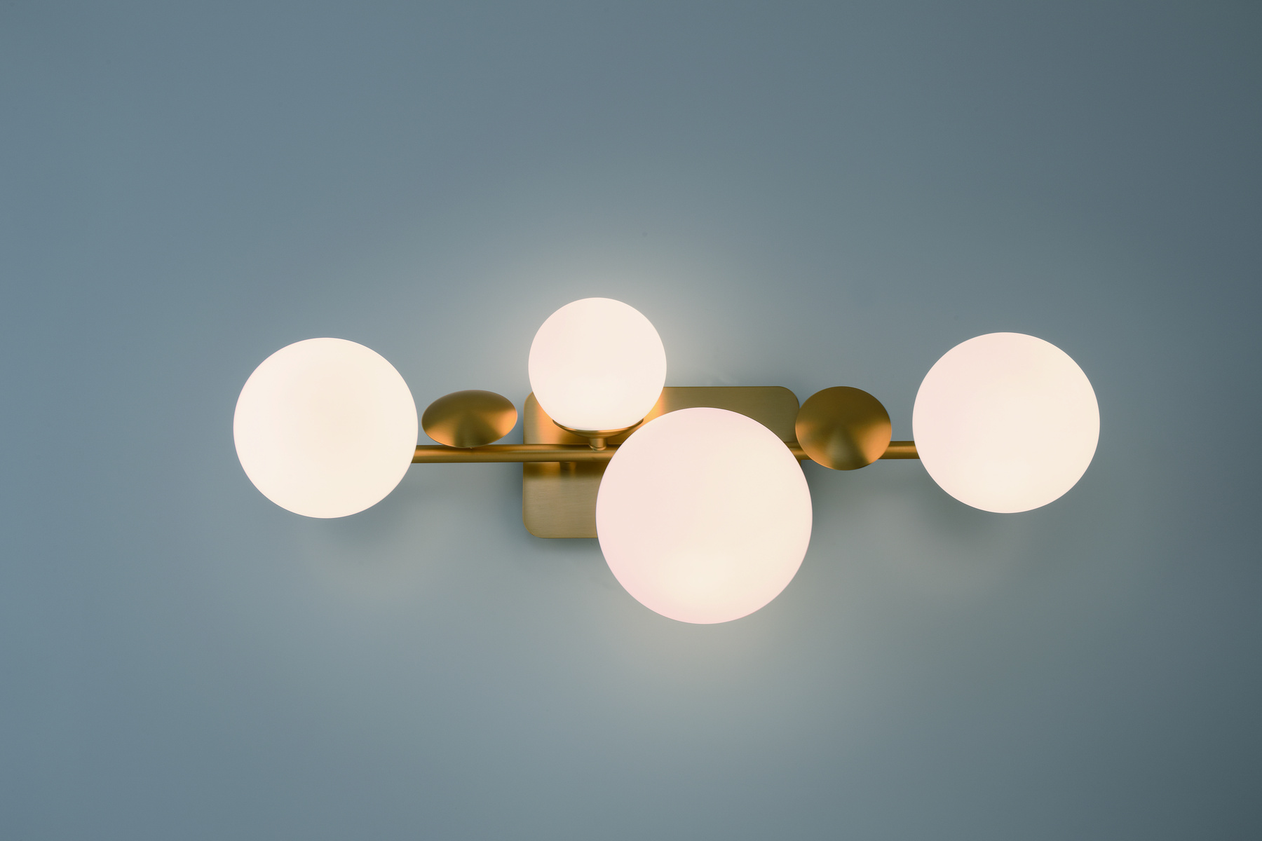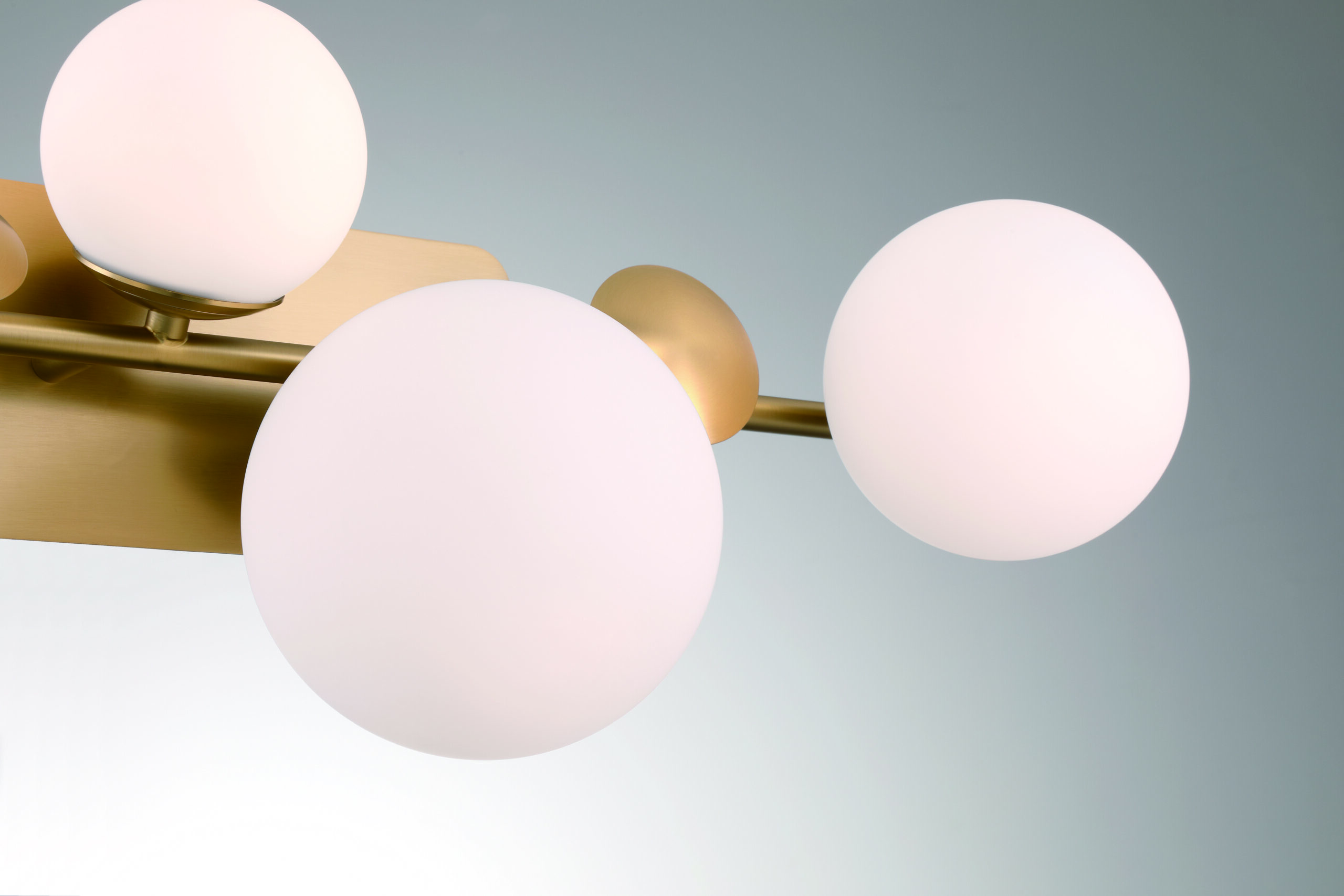 Vine captures the whimsical rise of bubbles in a glass of champagne and brings that motion to life through light. Along a slender supporting rail, orbs of opal glass and shallow round plates seem to dance with joyful rhythm, creating a vanity light that feels both graceful and fun.