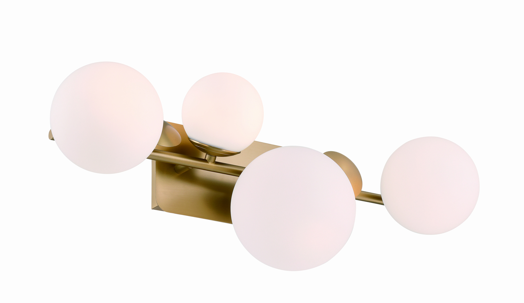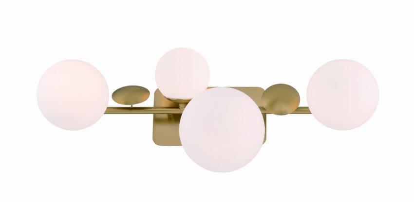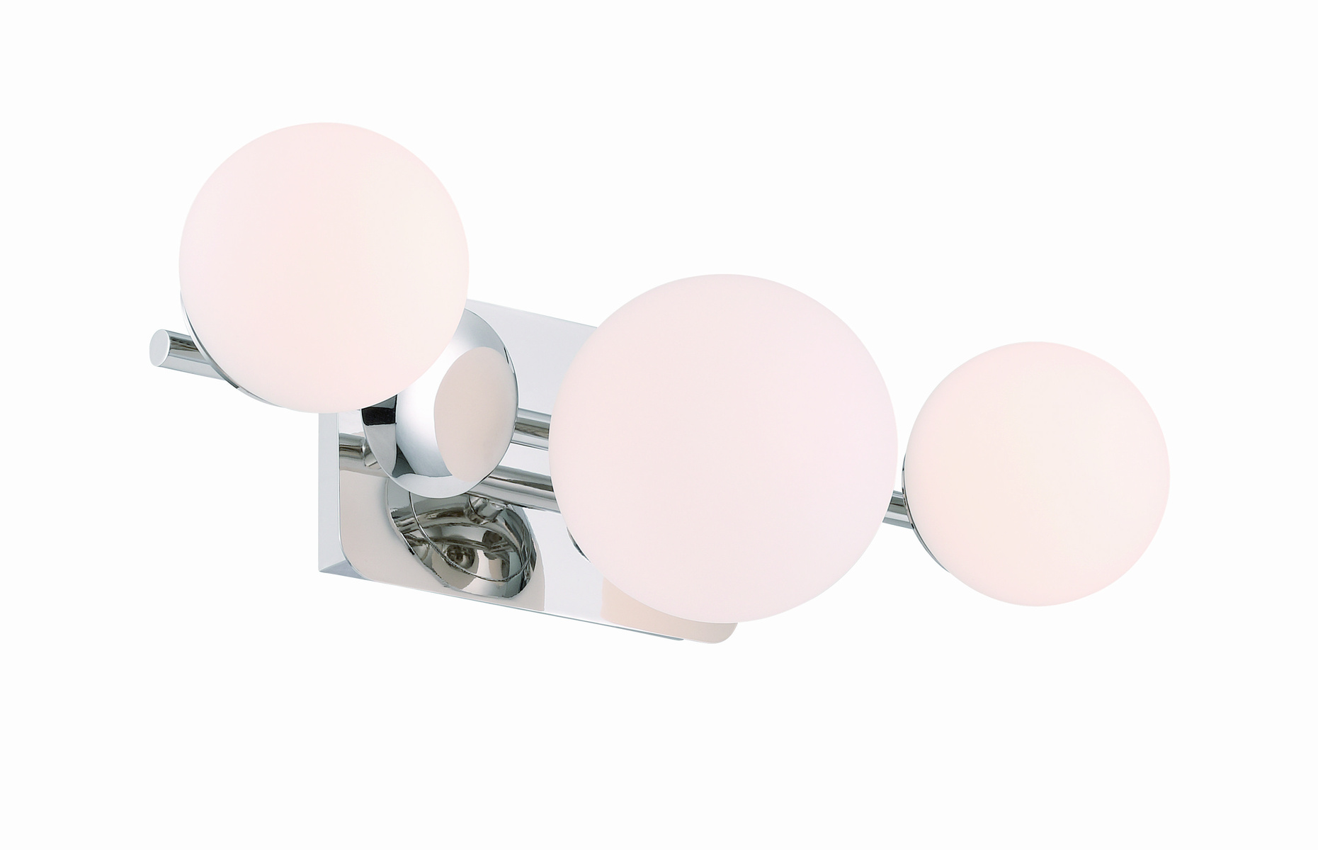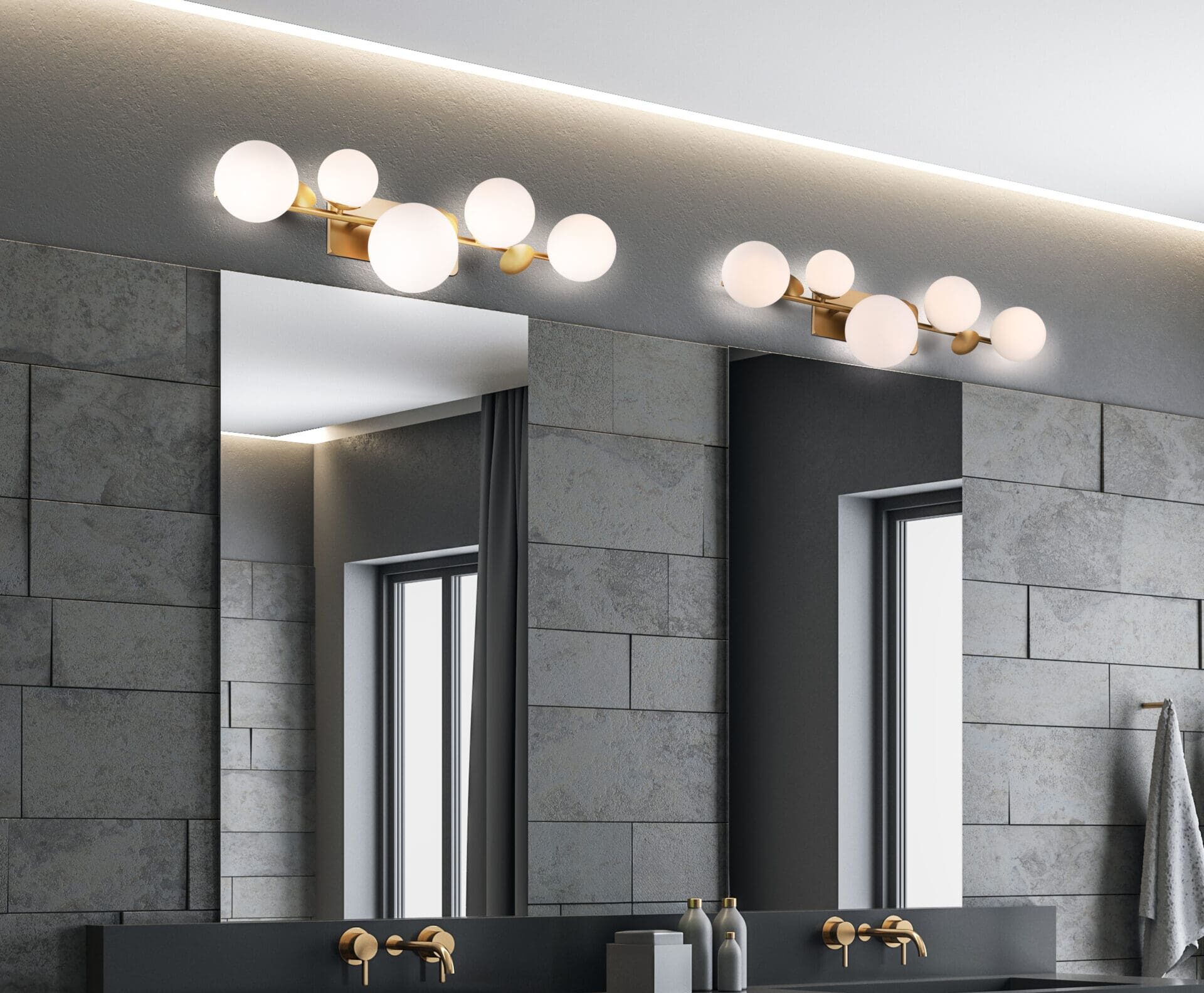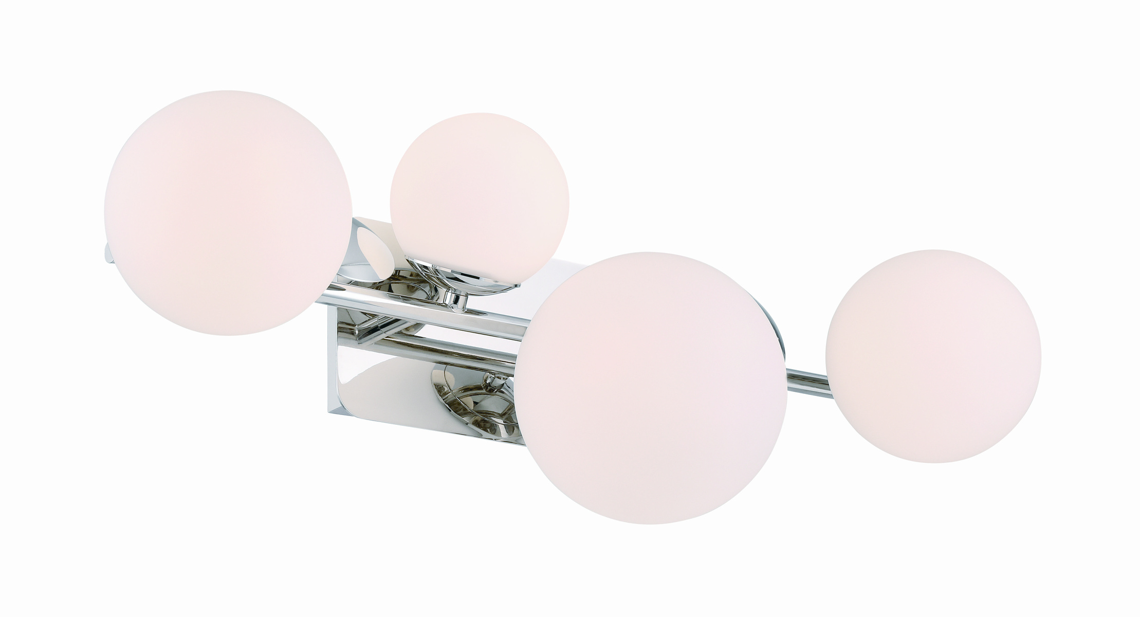 Vine captures the whimsical rise of bubbles in a glass of champagne and brings that motion to life through light. Along a slender supporting rail, orbs of opal glass and shallow round plates seem to dance with joyful rhythm, creating a vanity light that feels both graceful and fun.