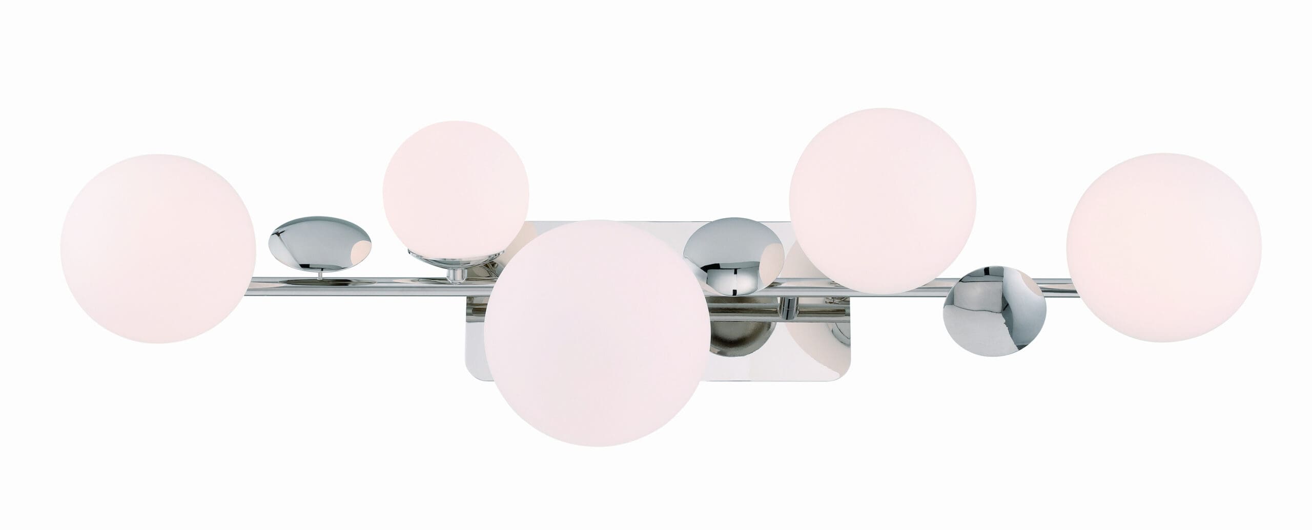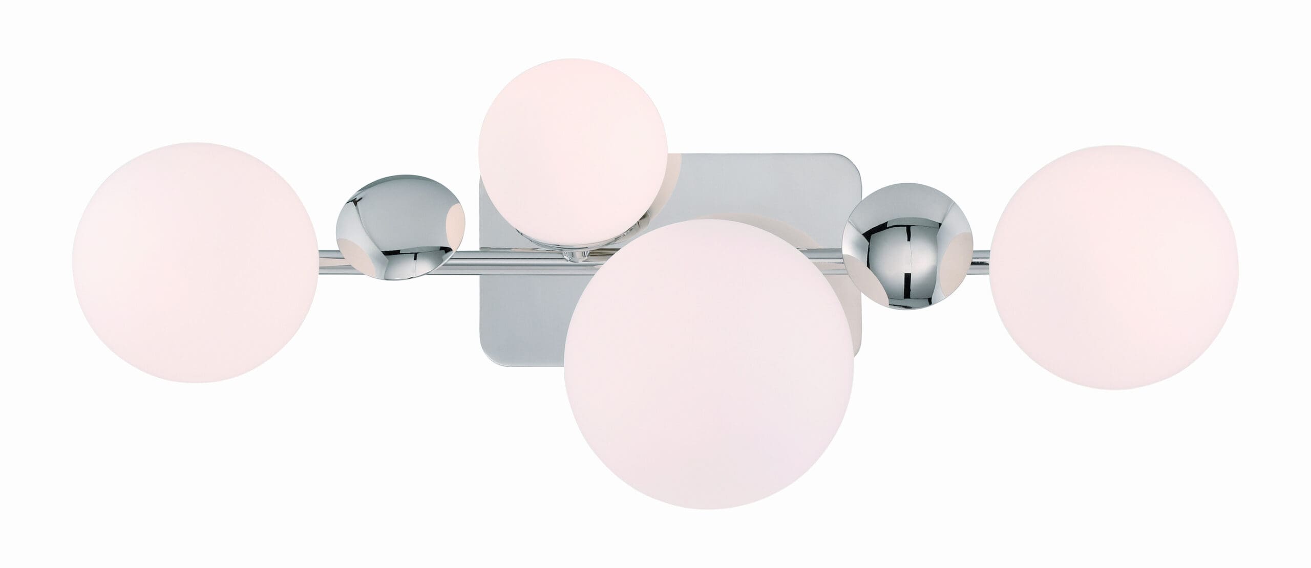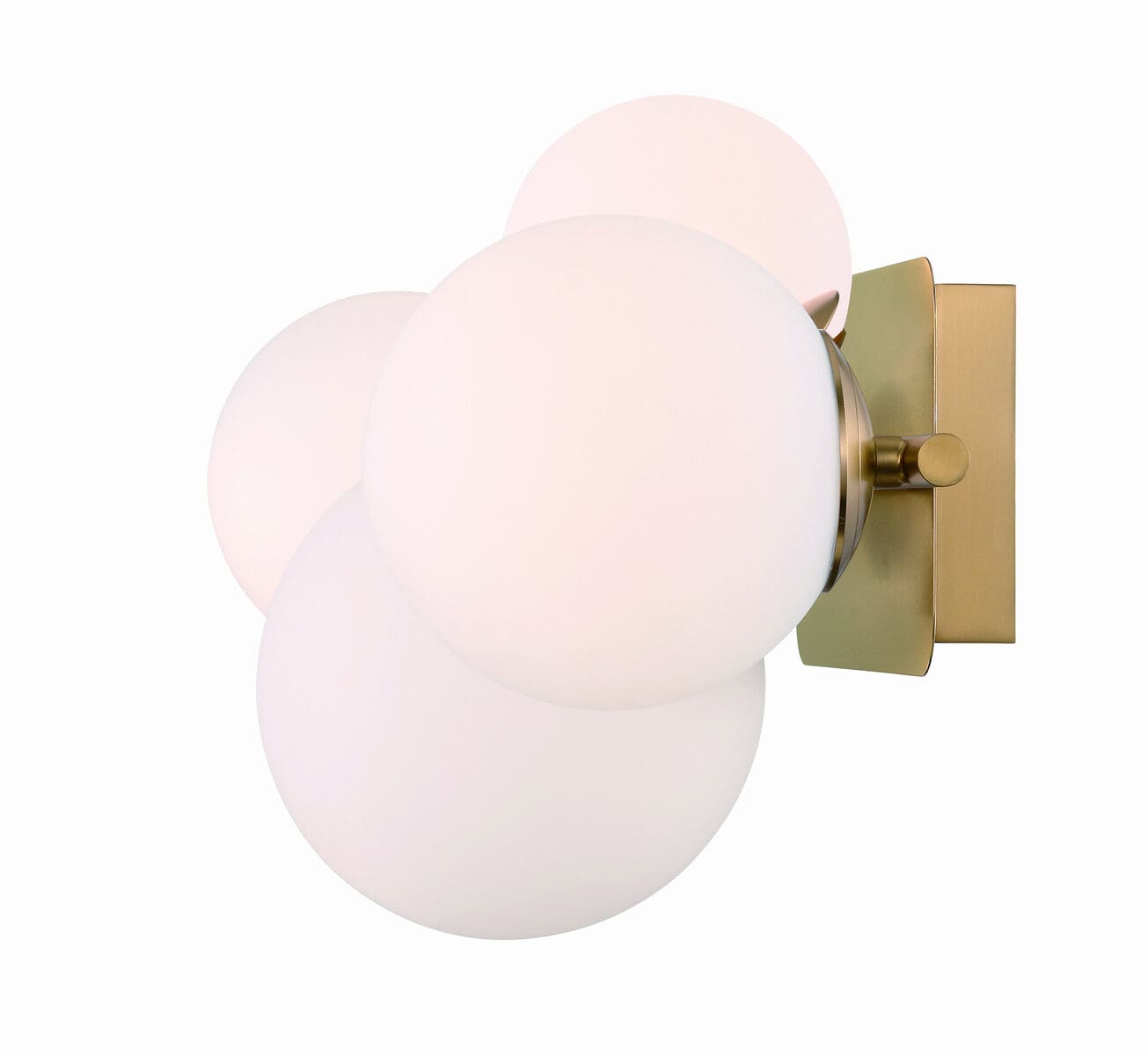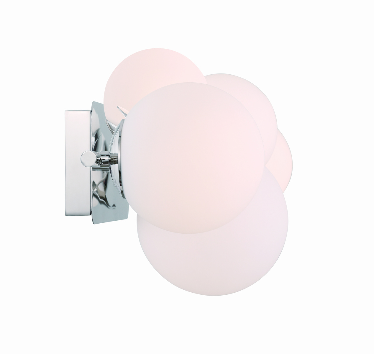 Vine captures the whimsical rise of bubbles in a glass of champagne and brings that motion to life through light. Along a slender supporting rail, orbs of opal glass and shallow round plates seem to dance with joyful rhythm, creating a vanity light that feels both graceful and fun.